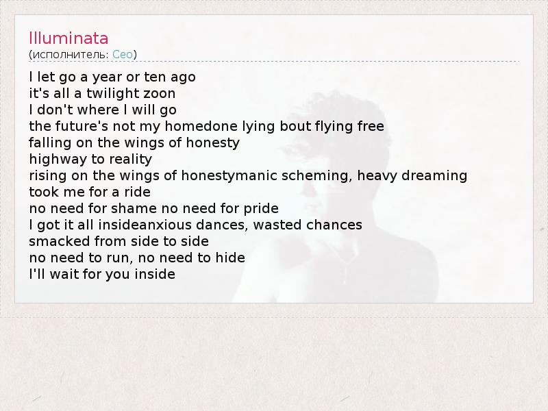 I let go a year or ten ago it's all a twilight zoon I don't where I will go the future's not my homedone lying bout flying free falling on the wings of honesty highway to reality rising on the wings of honestymanic scheming, heavy dreaming took me for a ride no need for shame no need for pride I got it all insideanxious dances, wasted chances smacked from side to side no need to run, no need to hide I'll wait for you inside