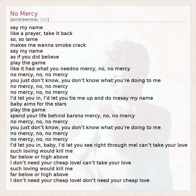say my name like a prayer, take it back so, so lame makes me wanna smoke crack say my name as if you did believe play the game like it had what you needno mercy, no, no mercy no mercy, no, no mercy you just don't know, you don't know what you're doing to me no mercy, no, no mercy no mercy, no, no mercy I'd let you in, I'd let you tie me up and do mesay my name baby aims for the stars play the game spend your life behind barsno mercy, no, no mercy no mercy, no, no mercy you just don't know, you don't know what you're doing to me no mercy, no, no mercy no mercy, no, no mercy I'd let you in, baby, I'd let you see right through meI can't take your love such loving would kill me far below or high above I don't need your cheap loveI can't take your love such loving would kill me far below or high above I don't need your cheap loveI don't need your cheap love