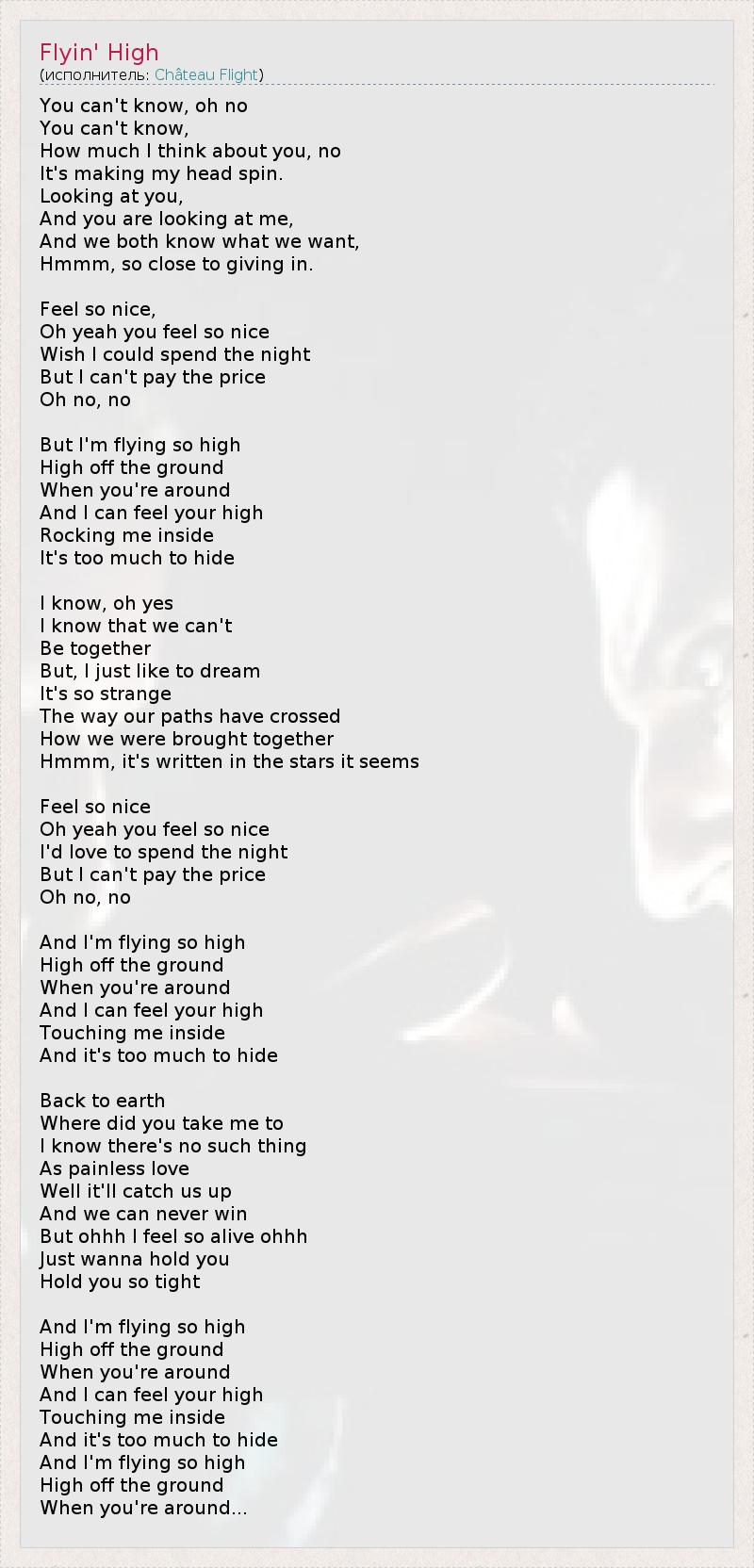 You can't know, oh no You can't know, How much I think about you, no It's making my head spin. Looking at you, And you are looking at me, And we both know what we want, Hmmm, so close to giving in. Feel so nice, Oh yeah you feel so nice Wish I could spend the night But I can't pay the price Oh no, no But I'm flying so high High off the ground When you're around And I can feel your high Rocking me inside It's too much to hide I know, oh yes I know that we can't Be together But, I just like to dream It's so strange The way our paths have crossed How we were brought together Hmmm, it's written in the stars it seems Feel so nice Oh yeah you feel so nice I'd love to spend the night But I can't pay the price Oh no, no And I'm flying so high High off the ground When you're around And I can feel your high Touching me inside And it's too much to hide Back to earth Where did you take me to I know there's no such thing As painless love Well it'll catch us up And we can never win But ohhh I feel so alive ohhh Just wanna hold you Hold you so tight And I'm flying so high High off the ground When you're around And I can feel your high Touching me inside And it's too much to hide And I'm flying so high High off the ground When you're around...