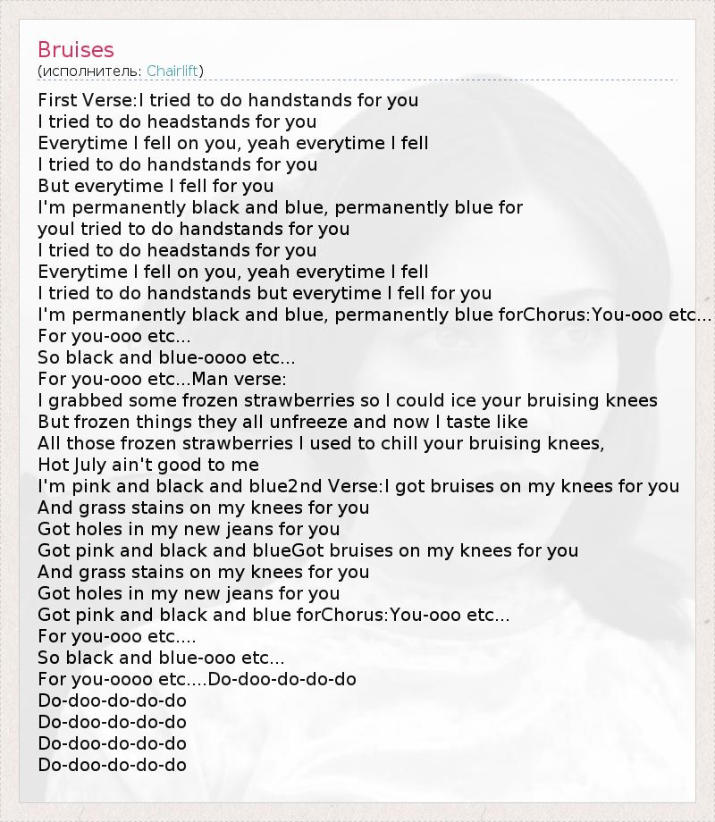 I'm pink and black and blue2nd Verse:I got bruises on my knees for you