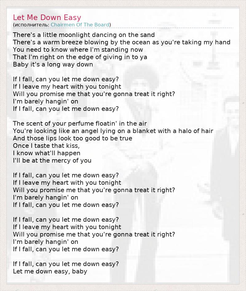 There's a little moonlight dancing on the sand There's a warm breeze blowing by the ocean as you're taking my hand You need to know where I'm standing now That I'm right on the edge of giving in to ya Baby it's a long way down If I fall, can you let me down easy? If I leave my heart with you tonight Will you promise me that you're gonna treat it right? I'm barely hangin' on If I fall, can you let me down easy? The scent of your perfume floatin' in the air You're looking like an angel lying on a blanket with a halo of hair And those lips look too good to be true Once I taste that kiss, I know what'll happen I'll be at the mercy of you If I fall, can you let me down easy? If I leave my heart with you tonight Will you promise me that you're gonna treat it right? I'm barely hangin' on If I fall, can you let me down easy? If I fall, can you let me down easy? If I leave my heart with you tonight Will you promise me that you're gonna treat it right? I'm barely hangin' on If I fall, can you let me down easy? If I fall, can you let me down easy? Let me down easy, baby