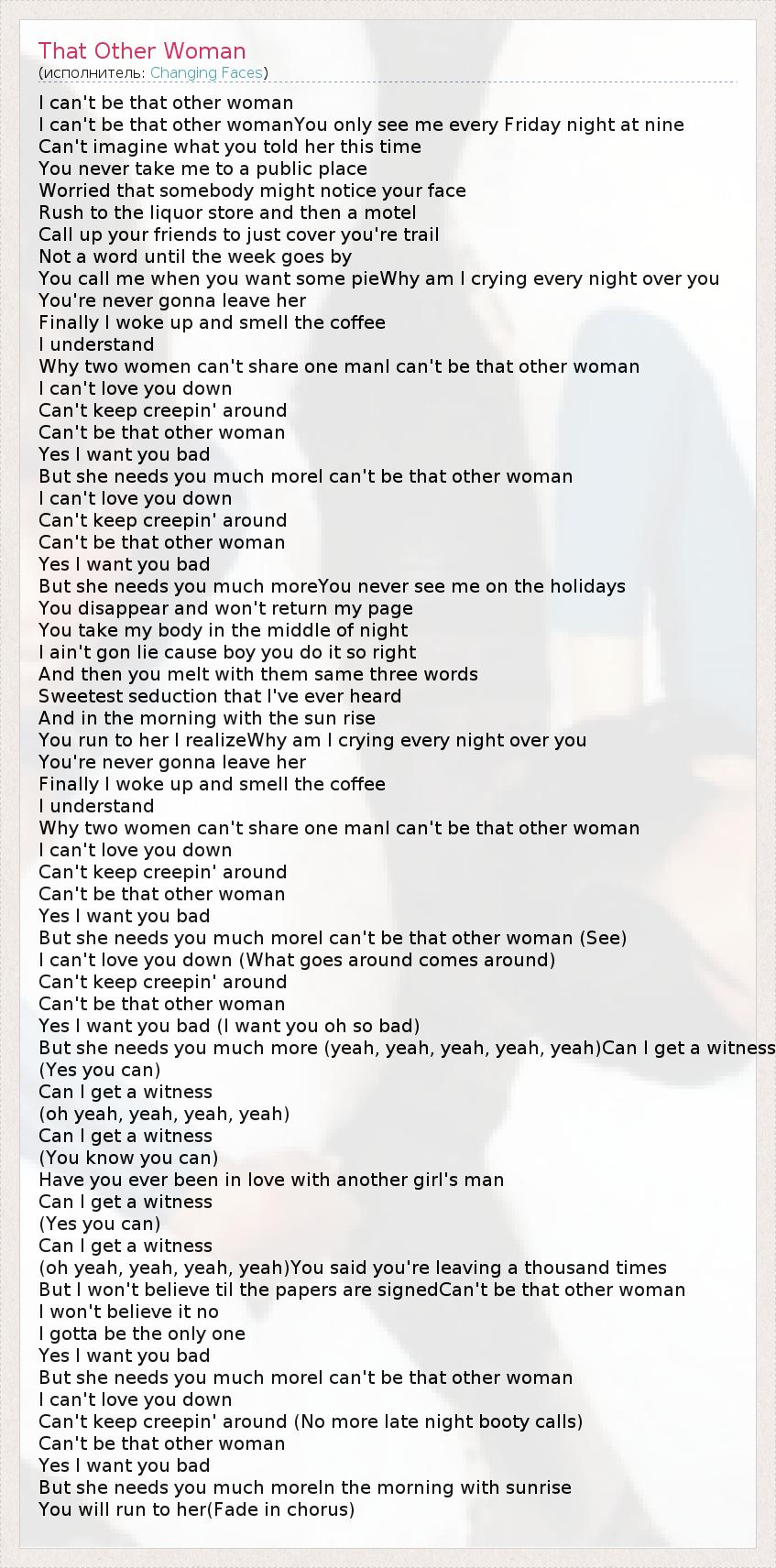 I can't be that other woman I can't be that other womanYou only see me every Friday night at nine Can't imagine what you told her this time You never take me to a public place Worried that somebody might notice your face Rush to the liquor store and then a motel Call up your friends to just cover you're trail Not a word until the week goes by You call me when you want some pieWhy am I crying every night over you You're never gonna leave her Finally I woke up and smell the coffee I understand Why two women can't share one manI can't be that other woman I can't love you down Can't keep creepin' around Can't be that other woman Yes I want you bad But she needs you much moreI can't be that other woman I can't love you down Can't keep creepin' around Can't be that other woman Yes I want you bad But she needs you much moreYou never see me on the holidays You disappear and won't return my page You take my body in the middle of night I ain't gon lie cause boy you do it so right And then you melt with them same three words Sweetest seduction that I've ever heard And in the morning with the sun rise You run to her I realizeWhy am I crying every night over you You're never gonna leave her Finally I woke up and smell the coffee I understand Why two women can't share one manI can't be that other woman I can't love you down Can't keep creepin' around Can't be that other woman Yes I want you bad But she needs you much moreI can't be that other woman (See) I can't love you down (What goes around comes around) Can't keep creepin' around Can't be that other woman Yes I want you bad (I want you oh so bad) But she needs you much more (yeah, yeah, yeah, yeah, yeah)Can I get a witness (Yes you can) Can I get a witness (oh yeah, yeah, yeah, yeah) Can I get a witness (You know you can) Have you ever been in love with another girl's man Can I get a witness (Yes you can) Can I get a witness (oh yeah, yeah, yeah, yeah)You said you're leaving a thousand times But I won't believe til the papers are signedCan't be that other woman I won't believe it no I gotta be the only one Yes I want you bad But she needs you much moreI can't be that other woman I can't love you down Can't keep creepin' around (No more late night booty calls) Can't be that other woman Yes I want you bad But she needs you much moreIn the morning with sunrise You will run to her(Fade in chorus)