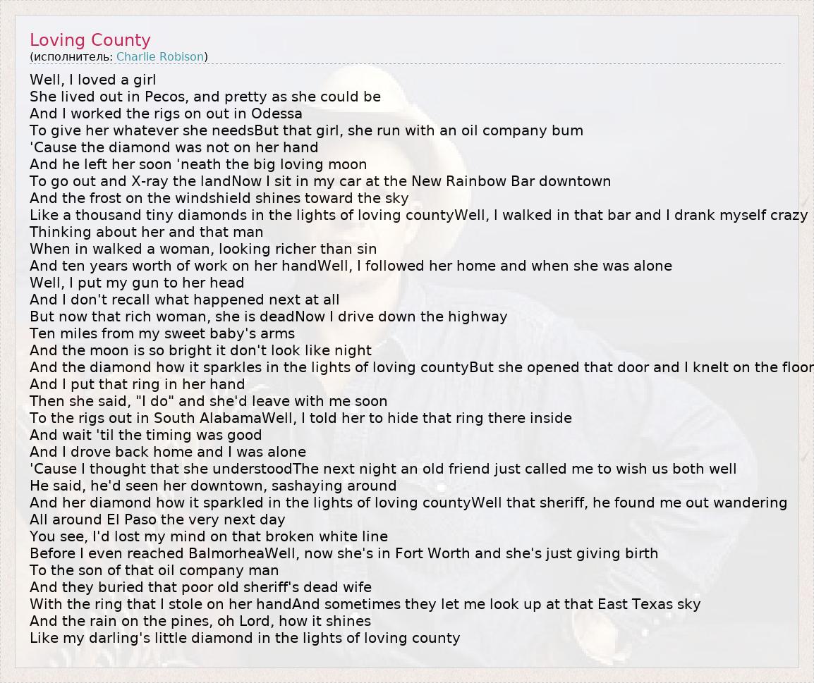 And her diamond how it sparkled in the lights of loving countyWell that sheriff, he found me out wandering
