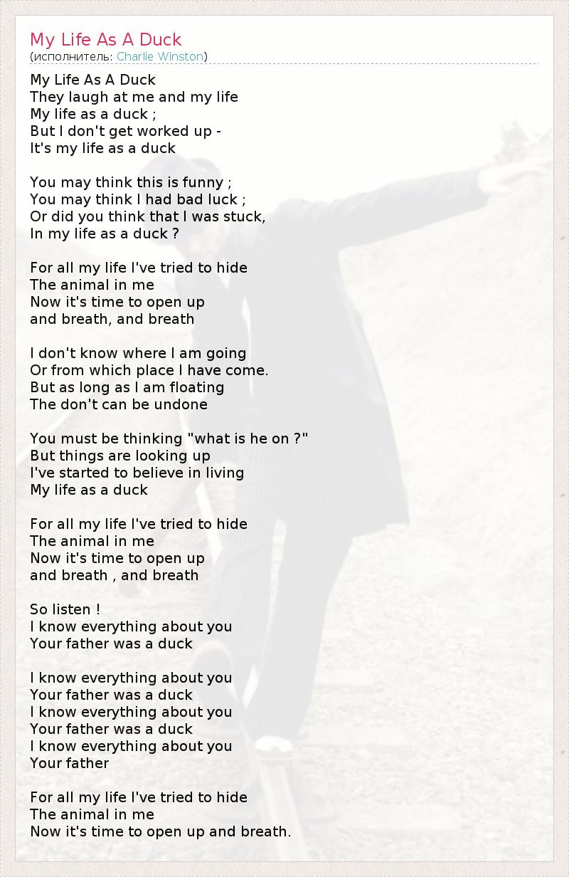 My Life As A Duck They laugh at me and my life My life as a duck ; But I don't get worked up - It's my life as a duck You may think this is funny ; You may think I had bad luck ; Or did you think that I was stuck, In my life as a duck ? For all my life I've tried to hide The animal in me Now it's time to open up and breath, and breath I don't know where I am going Or from which place I have come. But as long as I am floating The don't can be undone You must be thinking "what is he on ?" But things are looking up I've started to believe in living My life as a duck For all my life I've tried to hide The animal in me Now it's time to open up and breath , and breath So listen ! I know everything about you Your father was a duck I know everything about you Your father was a duck I know everything about you Your father was a duck I know everything about you Your father For all my life I've tried to hide The animal in me Now it's time to open up and breath.