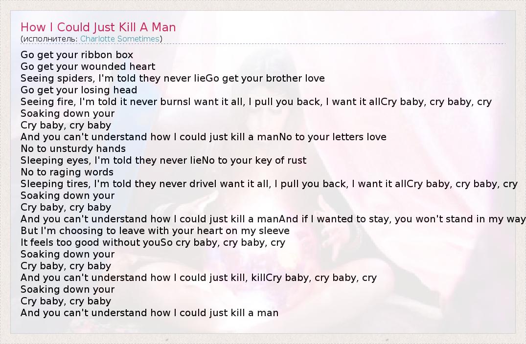Go get your ribbon box Go get your wounded heart Seeing spiders, I'm told they never lieGo get your brother love Go get your losing head Seeing fire, I'm told it never burnsI want it all, I pull you back, I want it allCry baby, cry baby, cry Soaking down your Cry baby, cry baby And you can't understand how I could just kill a manNo to your letters love No to unsturdy hands Sleeping eyes, I'm told they never lieNo to your key of rust No to raging words Sleeping tires, I'm told they never driveI want it all, I pull you back, I want it allCry baby, cry baby, cry Soaking down your Cry baby, cry baby And you can't understand how I could just kill a manAnd if I wanted to stay, you won't stand in my way But I'm choosing to leave with your heart on my sleeve It feels too good without youSo cry baby, cry baby, cry Soaking down your Cry baby, cry baby And you can't understand how I could just kill, killCry baby, cry baby, cry Soaking down your Cry baby, cry baby And you can't understand how I could just kill a man