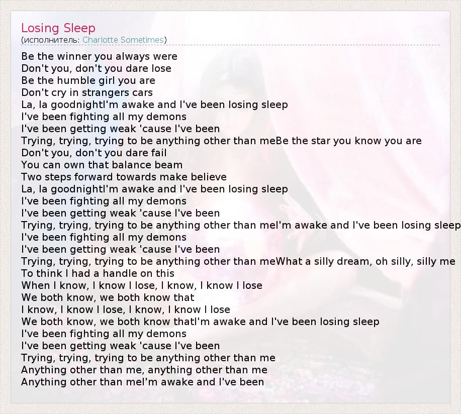 Be the winner you always were Don't you, don't you dare lose Be the humble girl you are Don't cry in strangers cars La, la goodnightI'm awake and I've been losing sleep I've been fighting all my demons I've been getting weak 'cause I've been Trying, trying, trying to be anything other than meBe the star you know you are Don't you, don't you dare fail You can own that balance beam Two steps forward towards make believe La, la goodnightI'm awake and I've been losing sleep I've been fighting all my demons I've been getting weak 'cause I've been Trying, trying, trying to be anything other than meI'm awake and I've been losing sleep I've been fighting all my demons I've been getting weak 'cause I've been Trying, trying, trying to be anything other than meWhat a silly dream, oh silly, silly me To think I had a handle on this When I know, I know I lose, I know, I know I lose We both know, we both know that I know, I know I lose, I know, I know I lose We both know, we both know thatI'm awake and I've been losing sleep I've been fighting all my demons I've been getting weak 'cause I've been Trying, trying, trying to be anything other than me Anything other than me, anything other than me Anything other than meI'm awake and I've been
