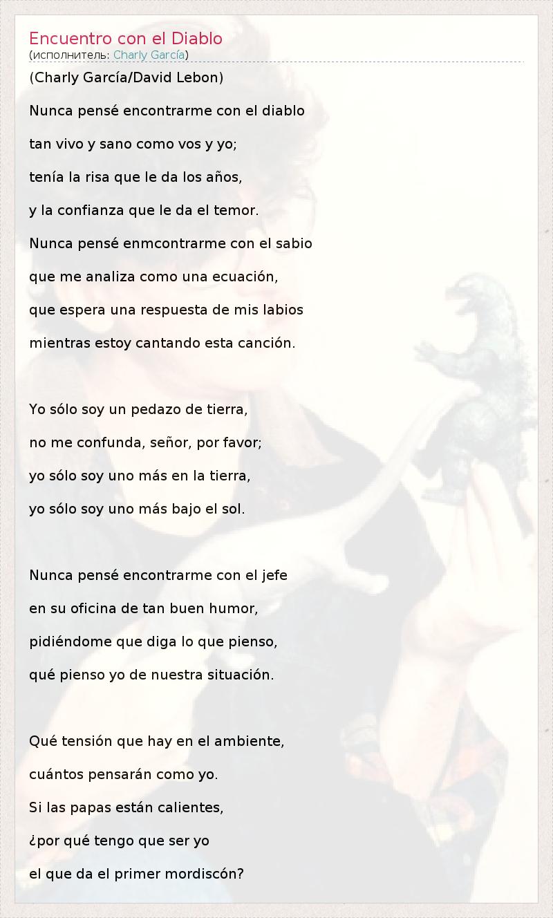 (Charly García/David Lebon) Nunca pensé encontrarme con el diablo tan vivo y sano como vos y yo; tenía la risa que le da los años, y la confianza que le da el temor. Nunca pensé enmcontrarme con el sabio que me analiza como una ecuación, que espera una respuesta de mis labios mientras estoy cantando esta canción. Yo sólo soy un pedazo de tierra, no me confunda, señor, por favor; yo sólo soy uno más en la tierra, yo sólo soy uno más bajo el sol. Nunca pensé encontrarme con el jefe en su oficina de tan buen humor, pidiéndome que diga lo que pienso, qué pienso yo de nuestra situación. Qué tensión que hay en el ambiente, cuántos pensarán como yo. Si las papas están calientes, ¿por qué tengo que ser yo el que da el primer mordiscón?