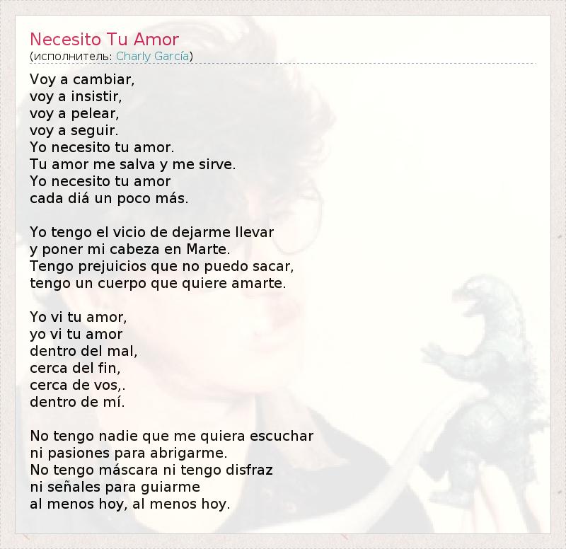 Voy a cambiar, voy a insistir, voy a pelear, voy a seguir. Yo necesito tu amor. Tu amor me salva y me sirve. Yo necesito tu amor cada diá un poco más. Yo tengo el vicio de dejarme llevar y poner mi cabeza en Marte. Tengo prejuicios que no puedo sacar, tengo un cuerpo que quiere amarte. Yo vi tu amor, yo vi tu amor dentro del mal, cerca del fin, cerca de vos,. dentro de mí. No tengo nadie que me quiera escuchar ni pasiones para abrigarme. No tengo máscara ni tengo disfraz ni señales para guiarme al menos hoy, al menos hoy.