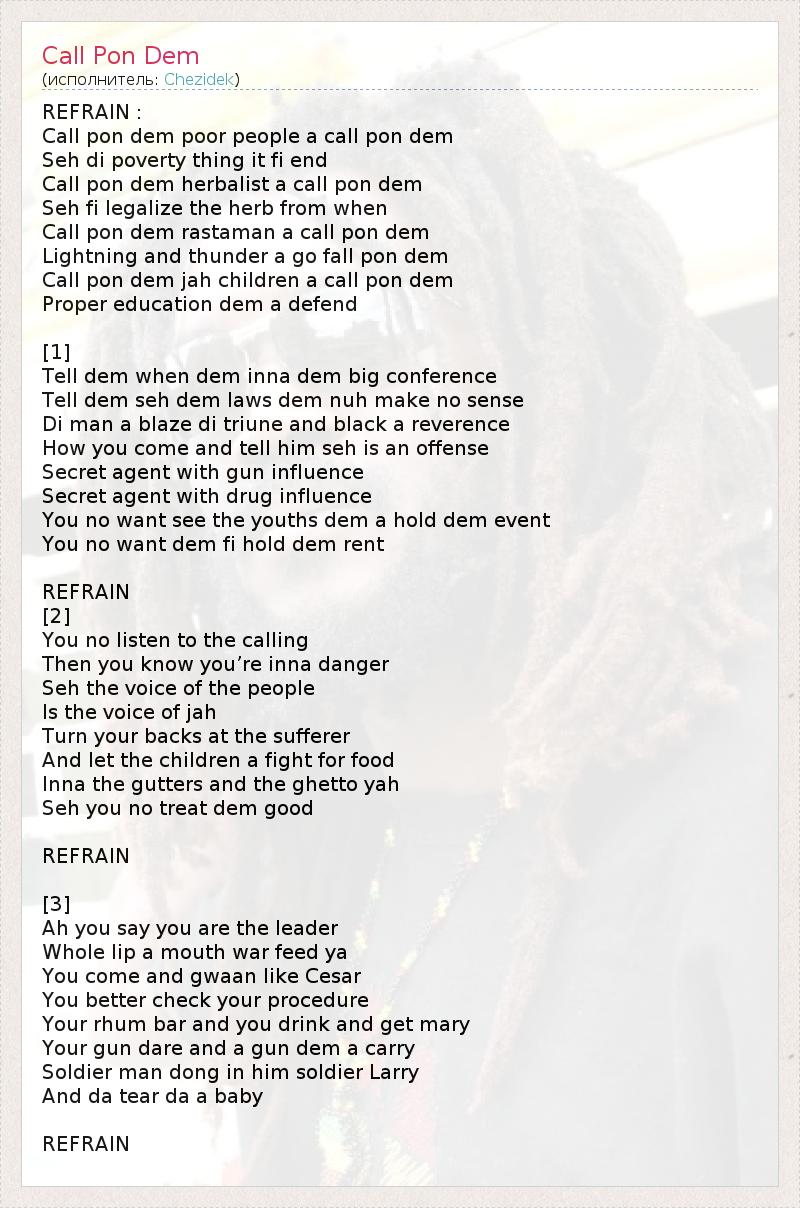 Припев : Позвоните PON дем бедных людейвызов PON дем Се -ди- бедность , что это фи конец Позвоните PON дем травниквызов PON дем Се Fi легализовать траву от того, когда Позвоните PON дем Rastamanвызов PON дем Молния и громПерейти падение PON дем Позвоните PON дем Jah детейвызов PON дем Правильное образование демзащищать [1] Расскажите дем , когда дем Инна DEM большой конференц- Расскажите дем Се дем законы дем Нух не имеет смысла Di человеку пожар ди триединого и черный почтение Как вы пришли и сказать ему, SEH являетсяпреступлением Секретный агент с пистолетом влияния Секретный агент с влиянием наркотиков Не Вы не хотите видеть молодежь дем событие удержания дем Не Вы не хотите дем Fi провести дем аренду ВОЗДЕРЖИВАЮТСЯ [ 2 ] Не Вы не слушать созыва Тогда вы знаете, что Инна опасность Се голос народа Этоголос Джа Превратите свои спины на страдальца И пустьдетям борьбу за пищу Инна желоба и гетто да ну Не Seh вы не лечить дем хорошо ВОЗДЕРЖИВАЮТСЯ [ 3 ] Ах, вы говорите, что вылидер Всего губырот война кормить Я. Вы приходите и Gwaan как Цезарь Вы лучше проверьте процедуру Ваше бар Rhum и пить и получить Мэри Ваш пистолет смел ипистолет дем произошел перенос Солдат человек дон в его солдат Ларри И да слезы даребенок ВОЗДЕРЖИВАЮТСЯ