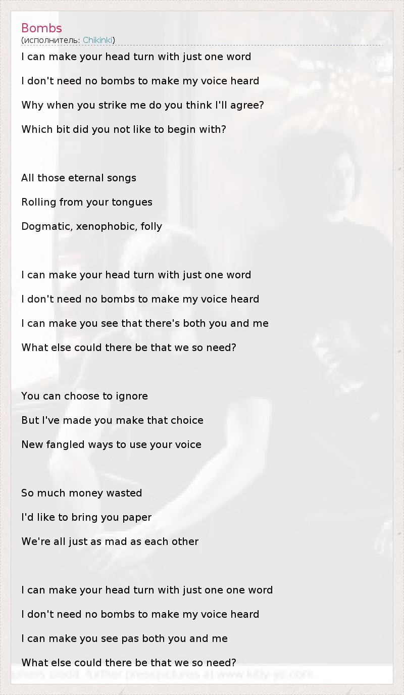 I can make your head turn with just one word I don't need no bombs to make my voice heard Why when you strike me do you think I'll agree? Which bit did you not like to begin with? All those eternal songs Rolling from your tongues Dogmatic, xenophobic, folly I can make your head turn with just one word I don't need no bombs to make my voice heard I can make you see that there's both you and me What else could there be that we so need? You can choose to ignore But I've made you make that choice New fangled ways to use your voice So much money wasted I'd like to bring you paper We're all just as mad as each other I can make your head turn with just one one word I don't need no bombs to make my voice heard I can make you see pas both you and me What else could there be that we so need?