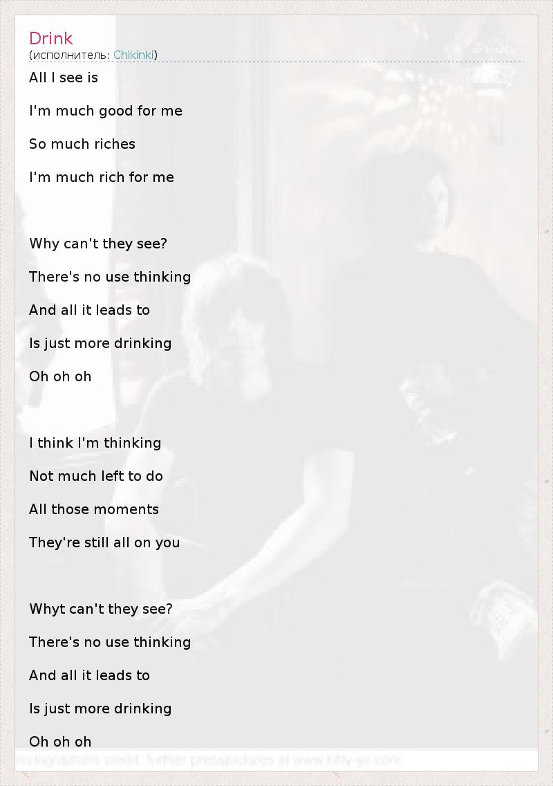 All I see is I'm much good for me So much riches I'm much rich for me Why can't they see? There's no use thinking And all it leads to Is just more drinking Oh oh oh I think I'm thinking Not much left to do All those moments They're still all on you Whyt can't they see? There's no use thinking And all it leads to Is just more drinking Oh oh oh