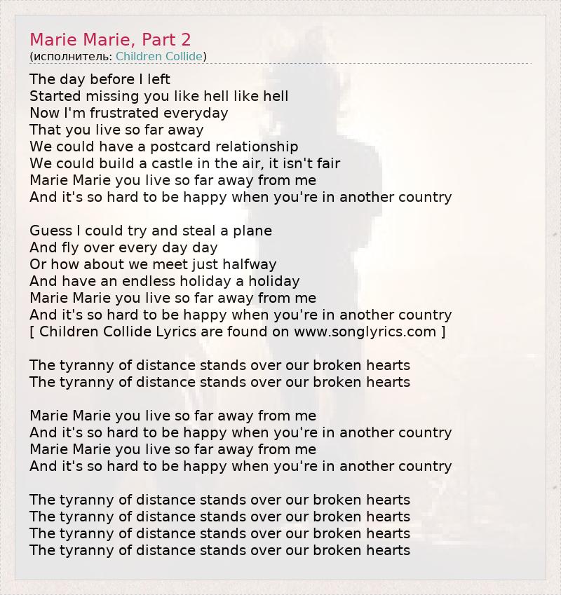 The day before I left Started missing you like hell like hell Now I'm frustrated everyday That you live so far away We could have a postcard relationship We could build a castle in the air, it isn't fair Marie Marie you live so far away from me And it's so hard to be happy when you're in another country Guess I could try and steal a plane And fly over every day day Or how about we meet just halfway And have an endless holiday a holiday Marie Marie you live so far away from me And it's so hard to be happy when you're in another country [ Children Collide Lyrics are found on www.songlyrics.com ] The tyranny of distance stands over our broken hearts The tyranny of distance stands over our broken hearts Marie Marie you live so far away from me And it's so hard to be happy when you're in another country Marie Marie you live so far away from me And it's so hard to be happy when you're in another country The tyranny of distance stands over our broken hearts The tyranny of distance stands over our broken hearts The tyranny of distance stands over our broken hearts The tyranny of distance stands over our broken hearts