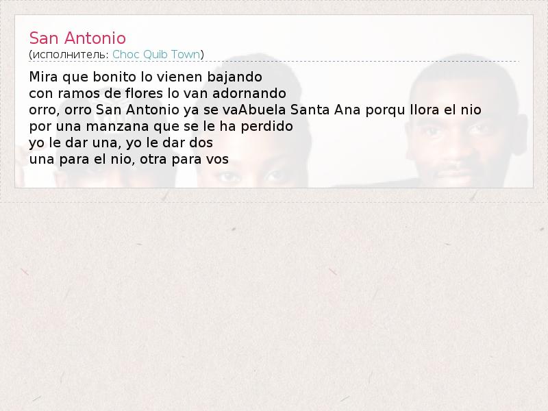 Mira que bonito lo vienen bajando con ramos de flores lo van adornando orro, orro San Antonio ya se vaAbuela Santa Ana porqu llora el nio por una manzana que se le ha perdido yo le dar una, yo le dar dos una para el nio, otra para vos