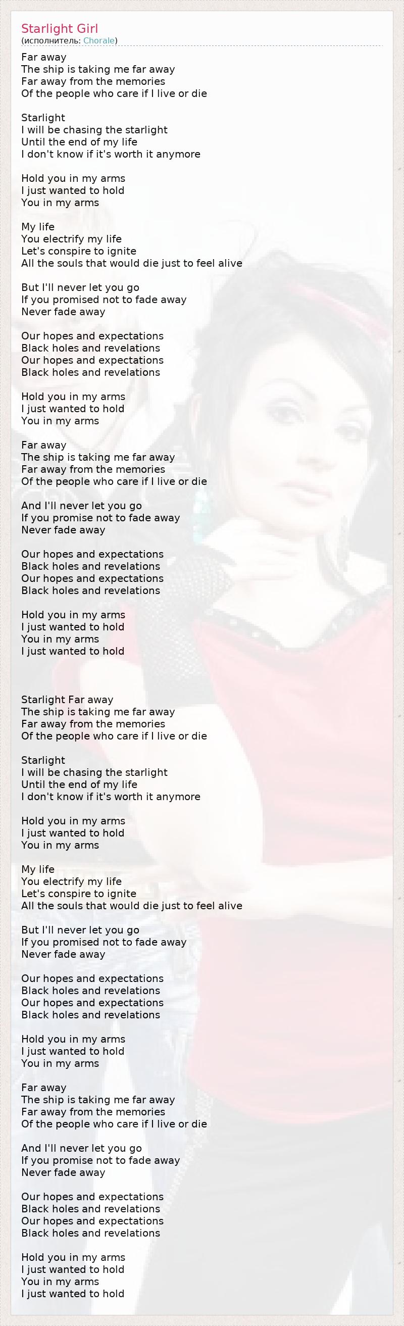 Далеко... Корабль несет меня далеко, Далеко от воспоминаний, От людей, которые волнуются, жив я или умер.... Звездный свет... Я буду преследовать звездный свет До конца своей жизни... Я не знаю, стоит ли это того.... Держать тебя в своих объятиях... Я хочу просто держать Тебя в своих объятиях... Мою жизнь... Ты электризуешь мою жизнь. Давай тайно сговоримся зажигать! Все души умерли бы, только чтобы почувствовать это.... Но я никогда не позволю тебе уйти, Если ты обещала не исчезать, Никогда не исчезать.... Наши надежды и ожидания, Черные дыры и откровения... Наши надежды и ожидания, Черные дыры и откровения... Держать тебя в своих объятиях... Я хочу просто держать Тебя в своих объятиях... Далеко... Корабль несет меня далеко, Далеко от воспоминаний, От людей, которые волнуются, жив я или умер.... И я никогда не позволю тебе уйти, Если ты обещала не изчезать, Никогда не исчезать... Наши надежды и ожидания, Черные дыры и откровения... Наши надежды и ожидания, Черные дыры и откровения... Держать тебя в своих объятиях, Я просто хочу держать Тебя в своих объятиях... Я просто хочу держать... Звёздный свет (перевод Анастасии Поляковой из Нижнего Новгорода) Далеко, Меня корабль уносит далеко. Воспоминания остались Там вместе с теми, кому важно, живой ли я. Звездный свет, И я иду на этот звездный свет, Иду всю жизнь, с начала до конца. А стоит ли таких усилий жизнь моя? Удержать тебя В своих объятиях Удержать тебя. Жизнь мою, Электризуешь снова жизнь мою, Давай, мы будем тайно зажигать? Все души умерли б за то, чтоб пожить, как мы... Не отпущу тебя, Потому что обещала ты, Обещала быть. В ожиданиях никчемных Мы с надеждой в дырах черных. В откровениях никчемных Мы с надеждой в дырах черных. Удержать тебя В своих объятиях Удержать тебя. Далеко, Меня корабль уносит далеко. Воспоминания остались Там вместе с теми, кому важно, живой ли я. Не отпущу тебя, Потому что обещала ты, Обещала быть. В ожиданиях никчемных Мы с надеждой в дырах черных. В откровениях никчемных Мы с надеждой в дырах черных. Удержать тебя В своих объятиях, Удержать тебя В своих объятиях.