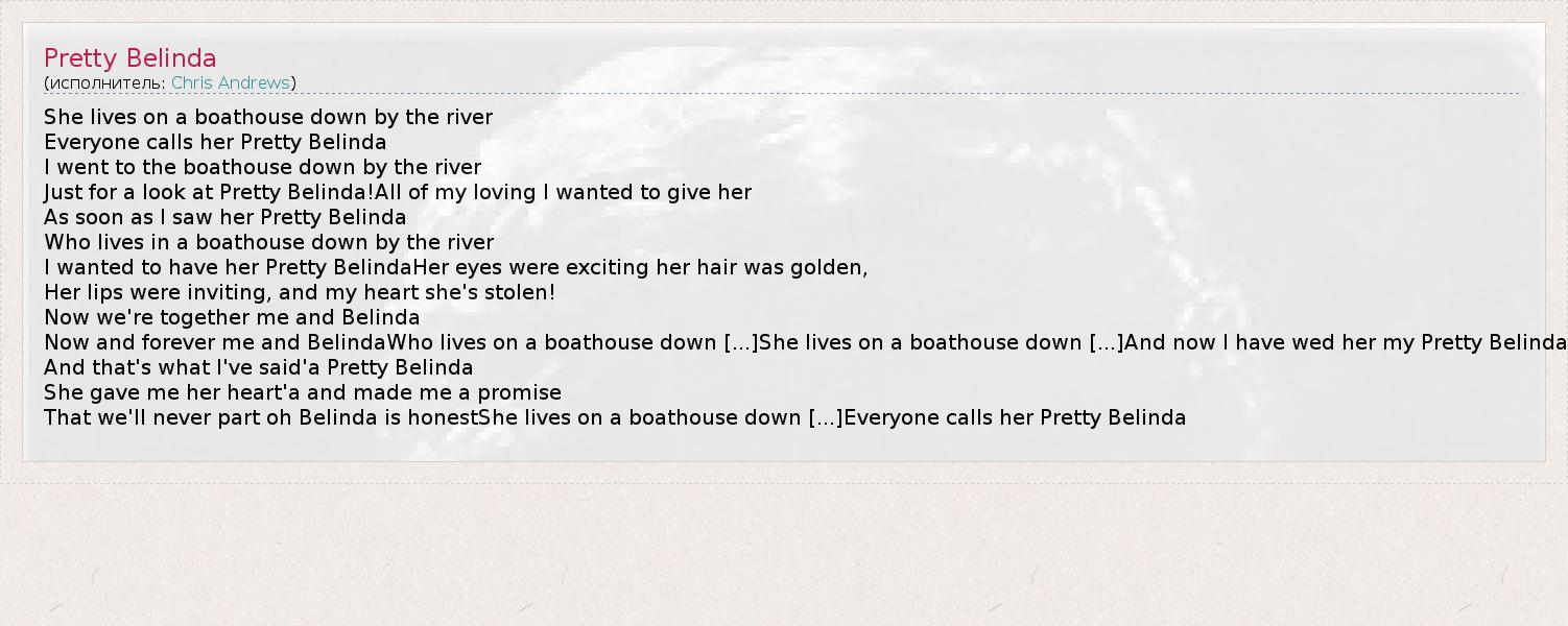 She lives on a boathouse down by the river Everyone calls her Pretty Belinda I went to the boathouse down by the river Just for a look at Pretty Belinda!All of my loving I wanted to give her As soon as I saw her Pretty Belinda Who lives in a boathouse down by the river I wanted to have her Pretty BelindaHer eyes were exciting her hair was golden, Her lips were inviting, and my heart she's stolen! Now we're together me and Belinda Now and forever me and BelindaWho lives on a boathouse down [...]She lives on a boathouse down [...]And now I have wed her my Pretty Belinda And that's what I've said'a Pretty Belinda She gave me her heart'a and made me a promise That we'll never part oh Belinda is honestShe lives on a boathouse down [...]Everyone calls her Pretty Belinda
