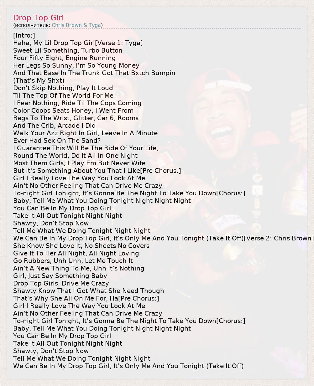 [Intro:] Haha, My Lil Drop Top Girl[Verse 1: Tyga] Sweet Lil Something, Turbo Button Four Fifty Eight, Engine Running Her Legs So Sunny, I'm So Young Money And That Base In The Trunk Got That Bxtch Bumpin (That's My Shxt) Don't Skip Nothing, Play It Loud Til The Top Of The World For Me I Fear Nothing, Ride Til The Cops Coming Color Coops Seats Honey, I Went From Rags To The Wrist, Glitter, Car 6, Rooms And The Crib, Arcade I Did Walk Your Azz Right In Girl, Leave In A Minute Ever Had Sex On The Sand? I Guarantee This Will Be The Ride Of Your Life, Round The World, Do It All In One Night Most Them Girls, I Play Em But Never Wife But It's Something About You That I Like[Pre Chorus:] Girl I Really Love The Way You Look At Me Ain't No Other Feeling That Can Drive Me Crazy To-night Girl Tonight, It's Gonna Be The Night To Take You Down[Chorus:] Baby, Tell Me What You Doing Tonight Night Night Night You Can Be In My Drop Top Girl Take It All Out Tonight Night Night Shawty, Don't Stop Now Tell Me What We Doing Tonight Night Night We Can Be In My Drop Top Girl, It's Only Me And You Tonight (Take It Off)[Verse 2: Chris Brown] She Know She Love It, No Sheets No Covers Give It To Her All Night, All Night Loving Go Rubbers, Unh Unh, Let Me Touch It Ain't A New Thing To Me, Unh It's Nothing Girl, Just Say Something Baby Drop Top Girls, Drive Me Crazy Shawty Know That I Got What She Need Though That's Why She All On Me For, Ha[Pre Chorus:] Girl I Really Love The Way You Look At Me Ain't No Other Feeling That Can Drive Me Crazy To-night Girl Tonight, It's Gonna Be The Night To Take You Down[Chorus:] Baby, Tell Me What You Doing Tonight Night Night Night You Can Be In My Drop Top Girl Take It All Out Tonight Night Night Shawty, Don't Stop Now Tell Me What We Doing Tonight Night Night We Can Be In My Drop Top Girl, It's Only Me And You Tonight (Take It Off)