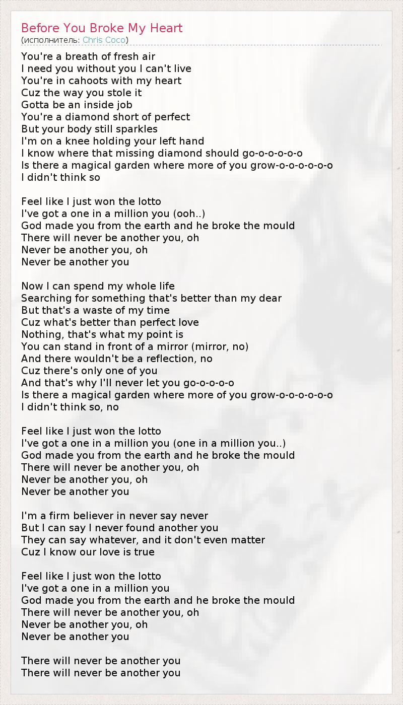 You're a breath of fresh air I need you without you I can't live You're in cahoots with my heart Cuz the way you stole it Gotta be an inside job You're a diamond short of perfect But your body still sparkles I'm on a knee holding your left hand I know where that missing diamond should go-o-o-o-o-o Is there a magical garden where more of you grow-o-o-o-o-o-o I didn't think so Feel like I just won the lotto I've got a one in a million you (ooh..) God made you from the earth and he broke the mould There will never be another you, oh Never be another you, oh Never be another you Now I can spend my whole life Searching for something that's better than my dear But that's a waste of my time Cuz what's better than perfect love Nothing, that's what my point is You can stand in front of a mirror (mirror, no) And there wouldn't be a reflection, no Cuz there's only one of you And that's why I'll never let you go-o-o-o-o Is there a magical garden where more of you grow-o-o-o-o-o-o I didn't think so, no Feel like I just won the lotto I've got a one in a million you (one in a million you..) God made you from the earth and he broke the mould There will never be another you, oh Never be another you, oh Never be another you I'm a firm believer in never say never But I can say I never found another you They can say whatever, and it don't even matter Cuz I know our love is true Feel like I just won the lotto I've got a one in a million you God made you from the earth and he broke the mould There will never be another you, oh Never be another you, oh Never be another you There will never be another you There will never be another you