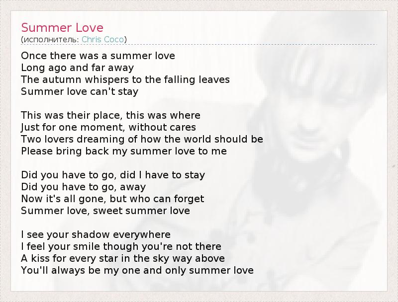 Однажды была летняя любовь, Давно и далеко. Осень шепчет падающим листьям. Летняя любовь не может остаться. Это было их место, это было там, где Лишь на миг, без ласк, Двое влюбленных мечтали о том, каким миру следовало бы быть. Пожалуйста, верни мне обратно мою летнюю любовь. Должна ли ты была уйти, должен ли я был остаться? Должна ли ты была уйти прочь? Теперь все это прошло, но кто может забыть Летнюю любовь, прекрасную летнюю любовь. Я вижу твою тень повсюду, Я чувствую твою улыбку, хотя тебя тут нет. Поцелуй каждой звезде в небе, там, высоко. Ты всегда будешь моей единственной летней любовью.