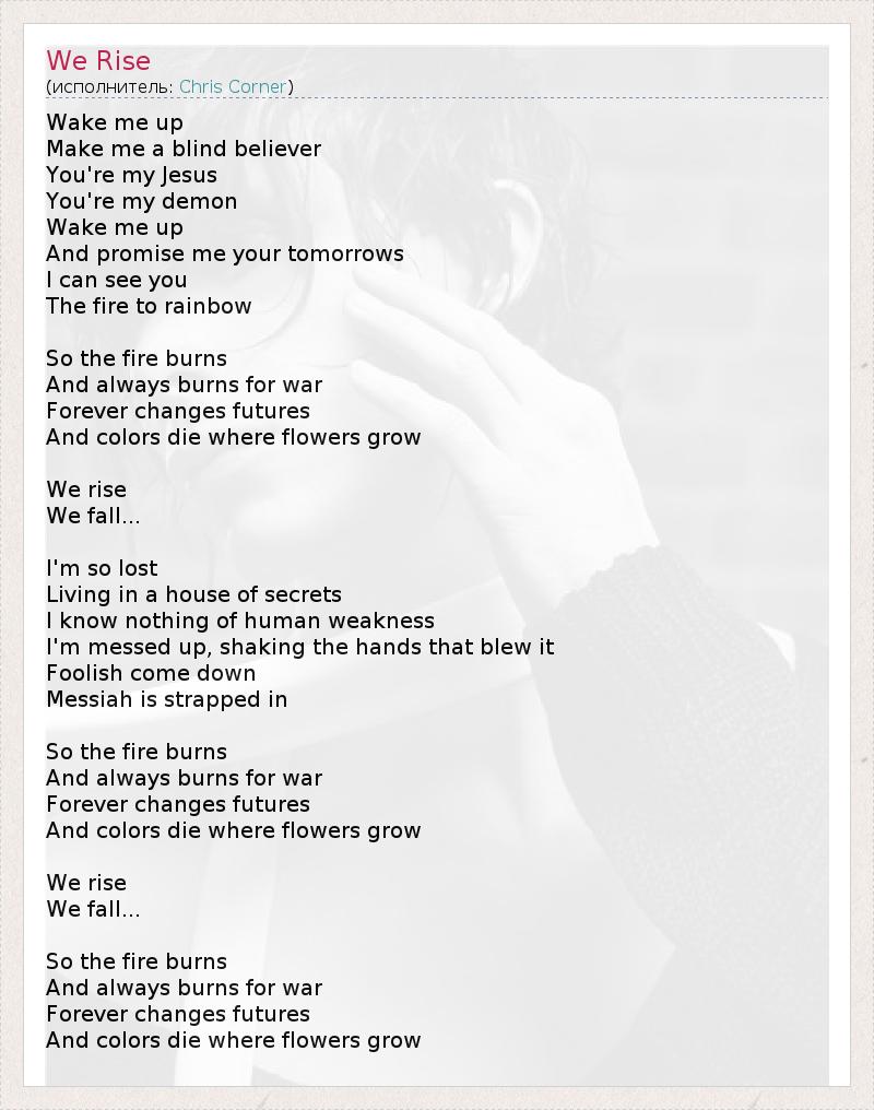 Разбуди меня, Сделай меня слепым верующим. Ты - мой Иисус, Ты - мой демон. Разбуди меня И обещай мне твои "завтра". Я вижу тебя В огне и радуге. Огонь горит И всегда предвещает войну. Вечность чередует варианты будущего, А краски меркнут там, где растут цветы. Мы поднимаемся, Мы падаем... Я потерялся, Живя в доме секретов. Я ничего не знаю о людской слабости. Я запутался, пожимая руки, что всё испортили. Глупцы опускаются, Мессия привязан. Огонь горит И всегда предвещает войну. Вечность чередует варианты будущего, А краски меркнут там, где растут цветы. Мы поднимаемся, Мы падаем... Огонь горит И всегда предвещает войну. Вечность чередует варианты будущего, А краски меркнут там, где растут цветы.