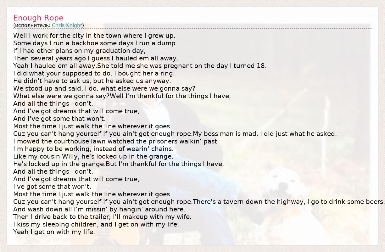 Well I work for the city in the town where I grew up. Some days I run a backhoe some days I run a dump. If I had other plans on my graduation day, Then several years ago I guess I hauled em all away. Yeah I hauled em all away.She told me she was pregnant on the day I turned 18. I did what your supposed to do. I bought her a ring. He didn't have to ask us, but he asked us anyway. We stood up and said, I do. what else were we gonna say? What else were we gonna say?Well I'm thankful for the things I have, And all the things I don't. And I've got dreams that will come true, And I've got some that won't. Most the time I just walk the line wherever it goes. Cuz you can't hang yourself if you ain't got enough rope.My boss man is mad. I did just what he asked. I mowed the courthouse lawn watched the prisoners walkin' past I'm happy to be working, instead of wearin' chains. Like my cousin Willy, he's locked up in the grange. He's locked up in the grange.But I'm thankful for the things I have, And all the things I don't. And I've got dreams that will come true, I've got some that won't. Most the time I just walk the line wherever it goes. Cuz you can't hang yourself if you ain't got enough rope.There's a tavern down the highway, I go to drink some beers. And wash down all I'm missin' by hangin' around here. Then I drive back to the trailer; I'll makeup with my wife. I kiss my sleeping children, and I get on with my life. Yeah I get on with my life.
