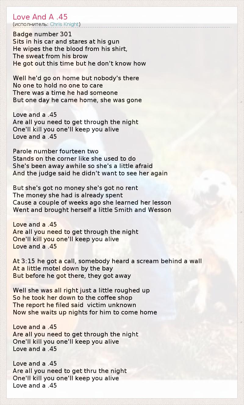 Badge number 301 Sits in his car and stares at his gun He wipes the the blood from his shirt, The sweat from his brow He got out this time but he don't know how Well he'd go on home but nobody's there No one to hold no one to care There was a time he had someone But one day he came home, she was gone Love and a .45 Are all you need to get through the night One'll kill you one'll keep you alive Love and a .45 Parole number fourteen two Stands on the corner like she used to do She's been away awhile so she's a little afraid And the judge said he didn't want to see her again But she's got no money she's got no rent The money she had is already spent Cause a couple of weeks ago she learned her lesson Went and brought herself a little Smith and Wesson Love and a .45 Are all you need to get through the night One'll kill you one'll keep you alive Love and a .45 At 3:15 he got a call, somebody heard a scream behind a wall At a little motel down by the bay But before he got there, they got away Well she was all right just a little roughed up So he took her down to the coffee shop The report he filed said victim unknown Now she waits up nights for him to come home Love and a .45 Are all you need to get through the night One'll kill you one'll keep you alive Love and a .45 Love and a .45 Are all you need to get thru the night One'll kill you one'll keep you alive Love and a .45