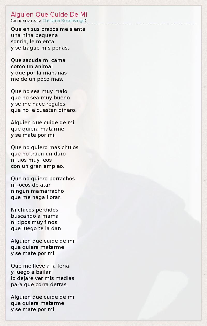 Que ан устой Brazos меня Sienta уна нина Pequena sonria , ле mienta у себе trague неправильно Penas . Que sacuda миль Кама Комо ООН животных у Que пор ла Mananas мне де ООН Poço мас. Не Que никакого моря Muy Malo не дие никакого моря Muy Bueno у себе меня HACE Regalos дие нет ле cuesten Dinero . Alguien дие Cuide де миль дие quiera matarme у себе мат POR миль . Que нет Quiero Рождество chulos не дие не Traen ООН Duro Ni TiOS Muy Feos кон ип гран Empleo . Que нет Quiero Borrachos Ni локомотивов де атар NINGUN mamarracho дие мне Хага llorar . Ni Chicos Perdidos Buscandoмама Ni Tipos Muy Finos дие luego те ла дан Alguien дие Cuide де миль дие quiera matarme у себе мат POR миль . Que меня lleveLa Feria у luego в Bailar ло dejare Ver MIS Исходная пункт дие Corra Detras . Alguien дие Cuide де миль дие quiera matarme у себе мат POR миль .