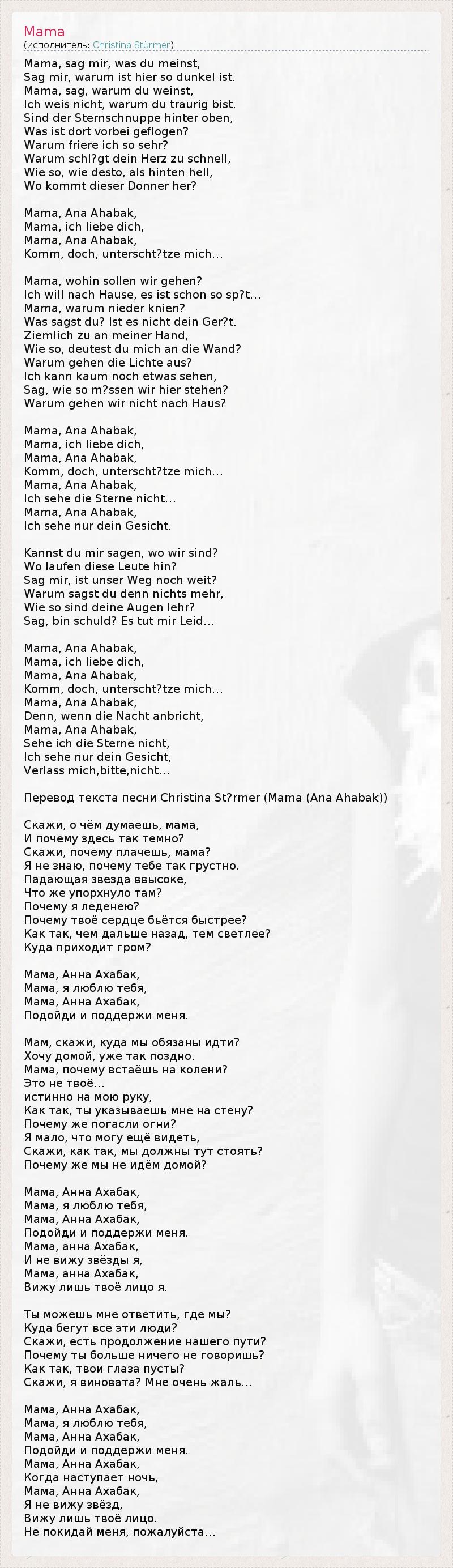 Перевод текста песни Christina St?rmer (Mama (Ana Ahabak))
