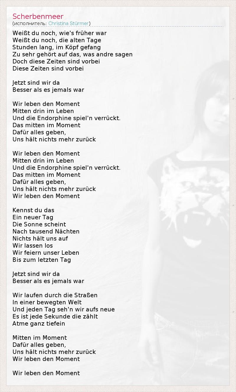 Помнишь ли, как было раньше? Помнишь ли прежние дни, Когда мы часами слушали и запоминали То, что говорили другие. Но это время прошло, Это время прошло... Теперь мы здесь, И это лучше, чем когда-либо Мы живем моментом Посреди жизни, И эндорфины играют, как сумасшедшие. За этот момент Можно отдать все, И ничто нас не остановит. Мы живем моментом Посреди жизни, И эндорфины играют, как сумасшедшие. За этот момент Можно отдать все, И ничто нас не остановит. Мы живём этим моментом. Знаешь ли ты это? Новый день, Солнце светит После тысячи ночей. Ничто нас не удержит. Мы освобождаем, Мы празднуем праздник жизни До последнего дня Теперь мы здесь, И это лучше, чем когда-либо Мы идем по улицам В движущемся мире, И каждый день мы видим что-то новое. Каждая секунда дорога - Вдохни глубоко. В этот момент - Отдать за него все. Нас ничто не удержит, Мы живем этим моментом. Мы живем этим моментом.