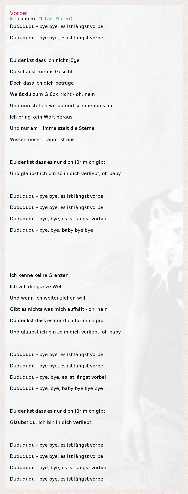 Это интересно:Эта миловидная брюнетка, подобно штурму, ворвалась в австрийские, немецкие и швейцарские хит-парады, ее концерты собирают тысячи поклонников, радиостанции с удовольствием крутят ее песни, и она очень комфортно чувствует себя в новой роли – в роли звезды, так как больше всего в этой жизни любит музыку. А еще ей нравится кино, хороший кофе, пицца, водка и Паоло Коэльо. Кристина Штюрмер является... продолжение