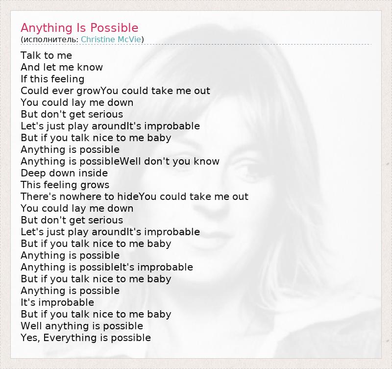 Talk to me And let me know If this feeling Could ever growYou could take me out You could lay me down But don't get serious Let's just play aroundIt's improbable But if you talk nice to me baby Anything is possible Anything is possibleWell don't you know Deep down inside This feeling grows There's nowhere to hideYou could take me out You could lay me down But don't get serious Let's just play aroundIt's improbable But if you talk nice to me baby Anything is possible Anything is possibleIt's improbable But if you talk nice to me baby Anything is possible It's improbable But if you talk nice to me baby Well anything is possible Yes, Everything is possible