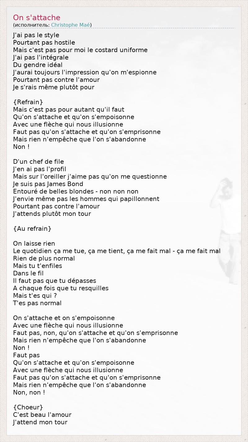Это интересно:Кристоф Маэ (Christophe Maé) – сценический псевдоним Кристофа Мартишона (Christophe Martichon). По официальной версии был придуман самим Кристофом в самом начале карьеры, и состоит из двух первых букв фамилии и первой буквы слова équipe (команда) – дословно «Команда Мартишонов», что должно было означать его признательность семье за поддержку и веру в его силы, которые он всегда ощущал. Будущий певец, композитор,... продолжение