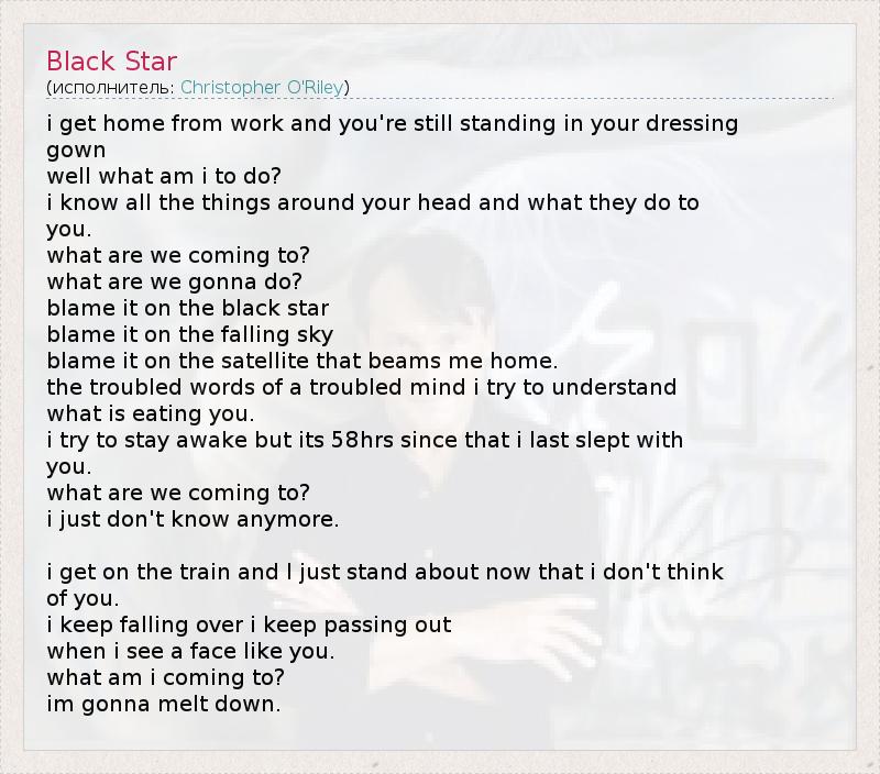 Я добрался домой после роботы, а ты всё еще стоишь в своем платье. Что ж, и что я должен делать? Я знаю всё, что вертится в твоей голове и что оно делает с тобой. К чему мы катимся? Что мы будем делать? Вини черную звезду, вини падающее небо, обвиняй спутник, что ведет меня домой. Волнующие слова обеспокоенного рассудка, я пытаюсь понять, что тебя грызет. Я пытаюсь быть бодрым, но 58 часов прошло, как я последний раз спал с тобой. К чему мы катимся? Я больше ничего не знаю. Вини черную звезду, вини падающее небо, обвиняй спутник, что ведет меня домой. Я вскочил на поезд, и стою и не думаю о тебе, я продолжаю спотыкаться продолжаю терять сознание, когда вижу лицо похожее на тебя. К чему я прихожу? Я растворюсь. Обвиняй черную звезду, обвиняй падающее небо, обвиняй спутник, что ведет меня домой. Это меня убивает. Это меня убивает.