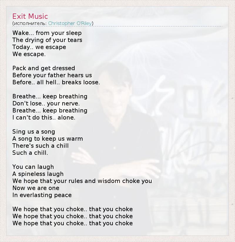 Пробудись... ото сна, Пускай слёзы высыхают. Сегодня... мы сбежим, Мы сбежим... Собирай вещи, одевайся, Пока твой отец не услышал нас, Пока... не разверзся... ад! Дыши... продолжай дышать, Не робей. Дыши... продолжай дышать, Я не могу делать это... один. Спой нам песню, Песню, которая согреет нас, Потому что тут так холодно, Так холодно. Ты можешь смеяться Едва заметной улыбкой. Надеемся, ты подавишься своими правилами и мудростью. А мы теперь – одно целое В вечном мире. Надеемся, ты подавишься... что ты подавишься. Надеемся, ты подавишься... что ты подавишься. Надеемся, ты подавишься... что ты подавишься.