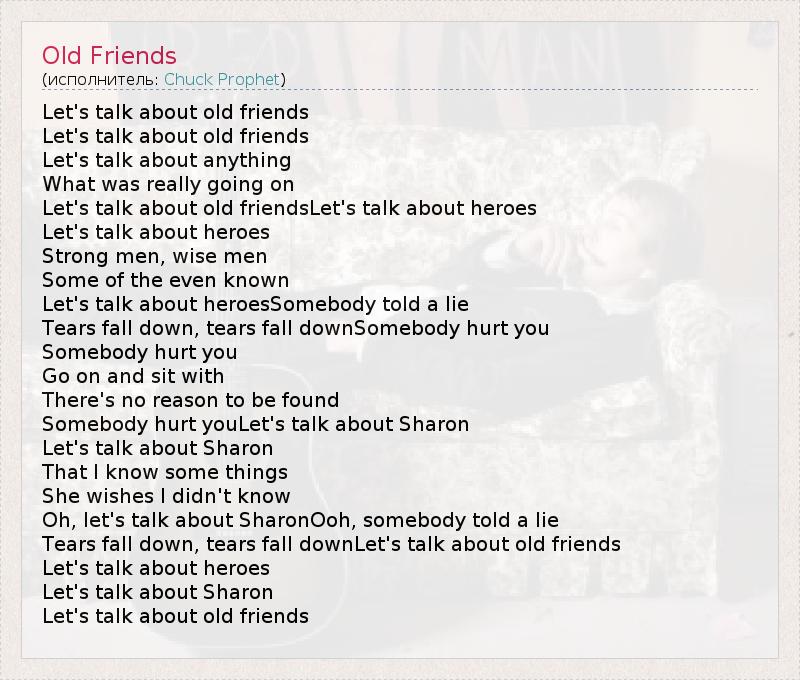 Let's talk about old friends Let's talk about old friends Let's talk about anything What was really going on Let's talk about old friendsLet's talk about heroes Let's talk about heroes Strong men, wise men Some of the even known Let's talk about heroesSomebody told a lie Tears fall down, tears fall downSomebody hurt you Somebody hurt you Go on and sit with There's no reason to be found Somebody hurt youLet's talk about Sharon Let's talk about Sharon That I know some things She wishes I didn't know Oh, let's talk about SharonOoh, somebody told a lie Tears fall down, tears fall downLet's talk about old friends Let's talk about heroes Let's talk about Sharon Let's talk about old friends