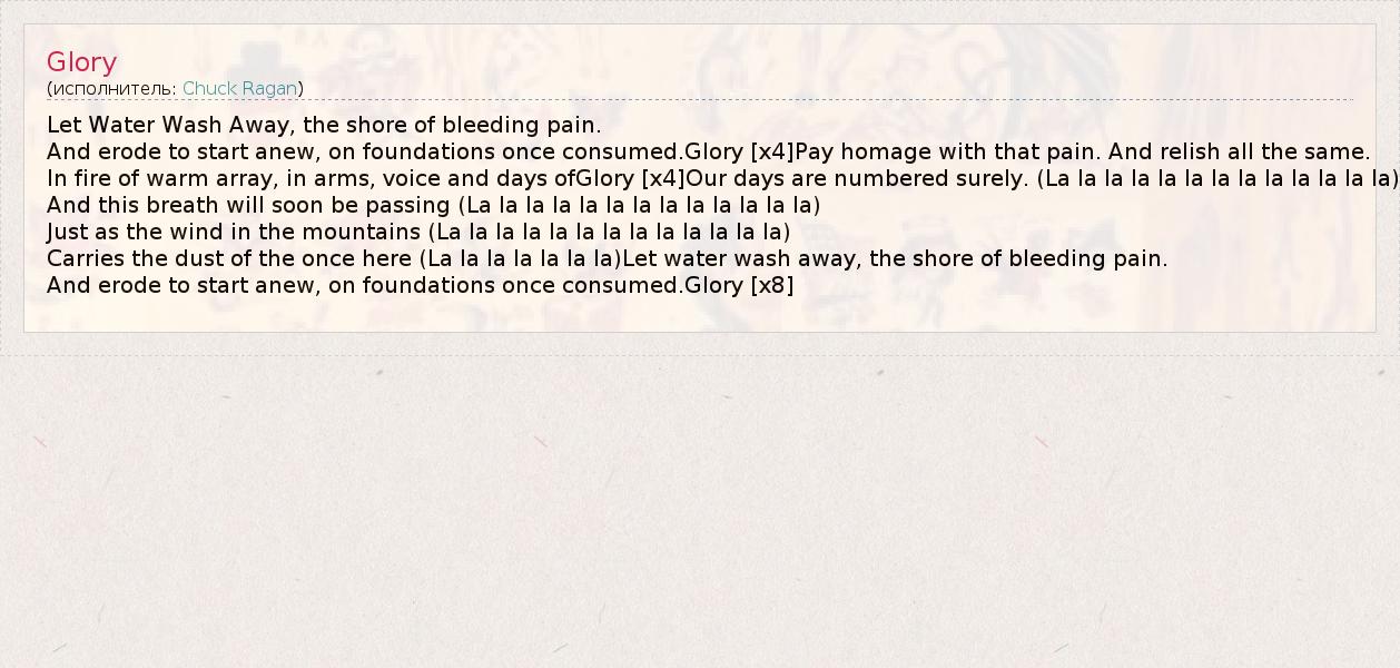 Let Water Wash Away, the shore of bleeding pain. And erode to start anew, on foundations once consumed.Glory [x4]Pay homage with that pain. And relish all the same. In fire of warm array, in arms, voice and days ofGlory [x4]Our days are numbered surely. (La la la la la la la la la la la la la) And this breath will soon be passing (La la la la la la la la la la la la la) Just as the wind in the mountains (La la la la la la la la la la la la la) Carries the dust of the once here (La la la la la la la)Let water wash away, the shore of bleeding pain. And erode to start anew, on foundations once consumed.Glory [x8]