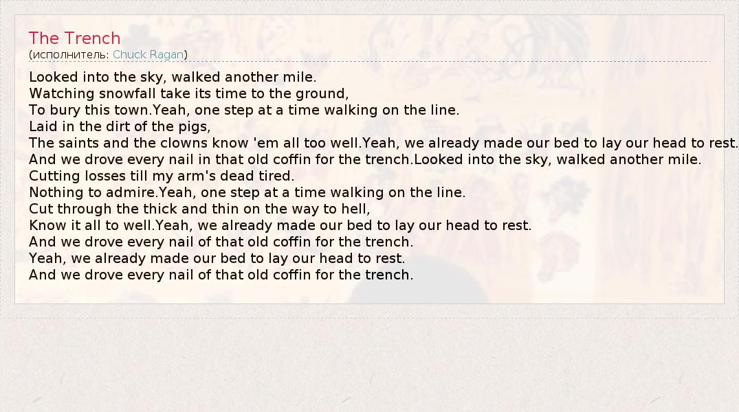 And we drove every nail in that old coffin for the trench.Looked into the sky, walked another mile.