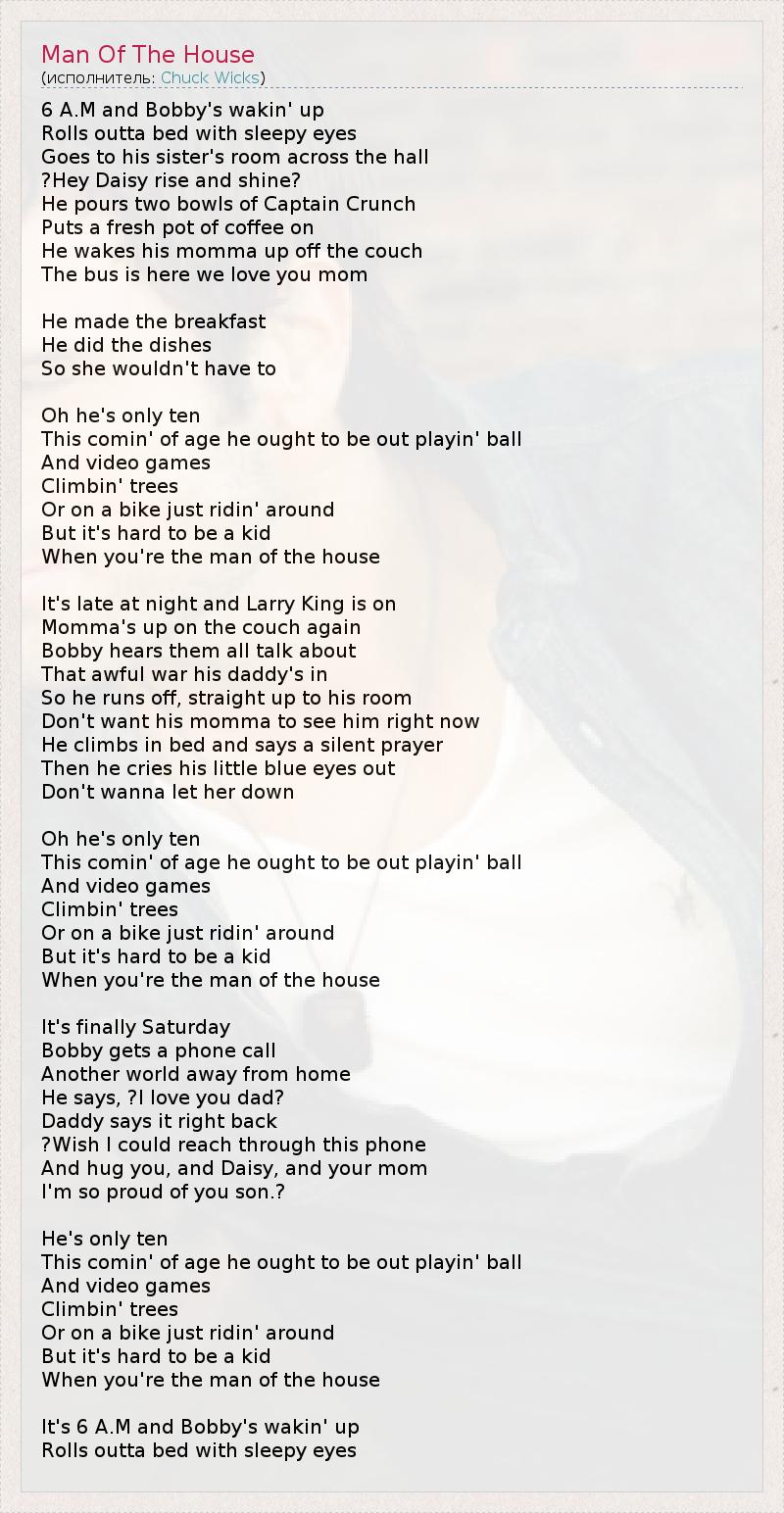 6 A.M and Bobby's wakin' up Rolls outta bed with sleepy eyes Goes to his sister's room across the hall ?Hey Daisy rise and shine? He pours two bowls of Captain Crunch Puts a fresh pot of coffee on He wakes his momma up off the couch The bus is here we love you mom He made the breakfast He did the dishes So she wouldn't have to Oh he's only ten This comin' of age he ought to be out playin' ball And video games Climbin' trees Or on a bike just ridin' around But it's hard to be a kid When you're the man of the house It's late at night and Larry King is on Momma's up on the couch again Bobby hears them all talk about That awful war his daddy's in So he runs off, straight up to his room Don't want his momma to see him right now He climbs in bed and says a silent prayer Then he cries his little blue eyes out Don't wanna let her down Oh he's only ten This comin' of age he ought to be out playin' ball And video games Climbin' trees Or on a bike just ridin' around But it's hard to be a kid When you're the man of the house It's finally Saturday Bobby gets a phone call Another world away from home He says, ?I love you dad? Daddy says it right back ?Wish I could reach through this phone And hug you, and Daisy, and your mom I'm so proud of you son.? He's only ten This comin' of age he ought to be out playin' ball And video games Climbin' trees Or on a bike just ridin' around But it's hard to be a kid When you're the man of the house It's 6 A.M and Bobby's wakin' up Rolls outta bed with sleepy eyes