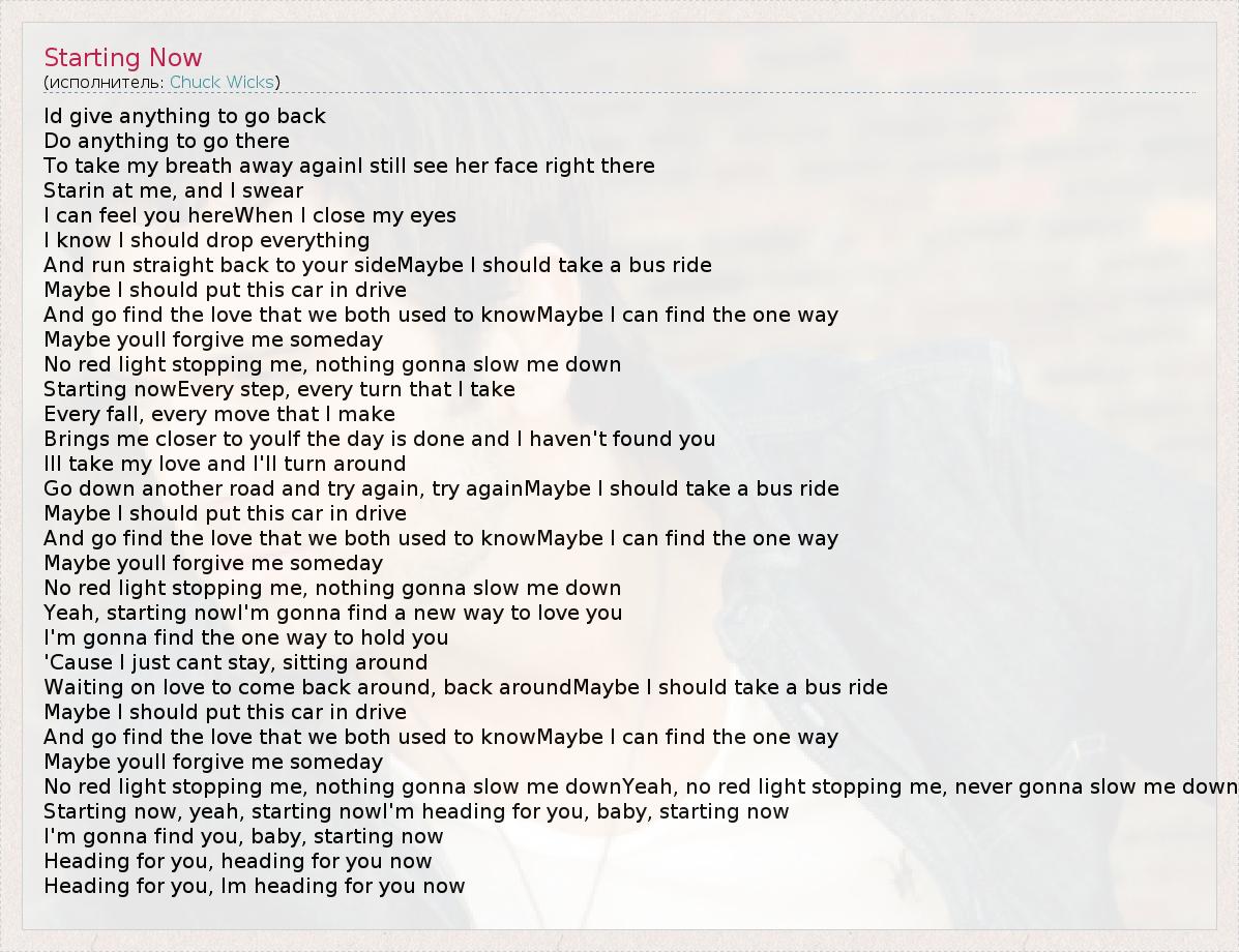 Id give anything to go back Do anything to go there To take my breath away againI still see her face right there Starin at me, and I swear I can feel you hereWhen I close my eyes I know I should drop everything And run straight back to your sideMaybe I should take a bus ride Maybe I should put this car in drive And go find the love that we both used to knowMaybe I can find the one way Maybe youll forgive me someday No red light stopping me, nothing gonna slow me down Starting nowEvery step, every turn that I take Every fall, every move that I make Brings me closer to youIf the day is done and I haven't found you Ill take my love and I'll turn around Go down another road and try again, try againMaybe I should take a bus ride Maybe I should put this car in drive And go find the love that we both used to knowMaybe I can find the one way Maybe youll forgive me someday No red light stopping me, nothing gonna slow me down Yeah, starting nowI'm gonna find a new way to love you I'm gonna find the one way to hold you 'Cause I just cant stay, sitting around Waiting on love to come back around, back aroundMaybe I should take a bus ride Maybe I should put this car in drive And go find the love that we both used to knowMaybe I can find the one way Maybe youll forgive me someday No red light stopping me, nothing gonna slow me downYeah, no red light stopping me, never gonna slow me down Starting now, yeah, starting nowI'm heading for you, baby, starting now I'm gonna find you, baby, starting now Heading for you, heading for you now Heading for you, Im heading for you now