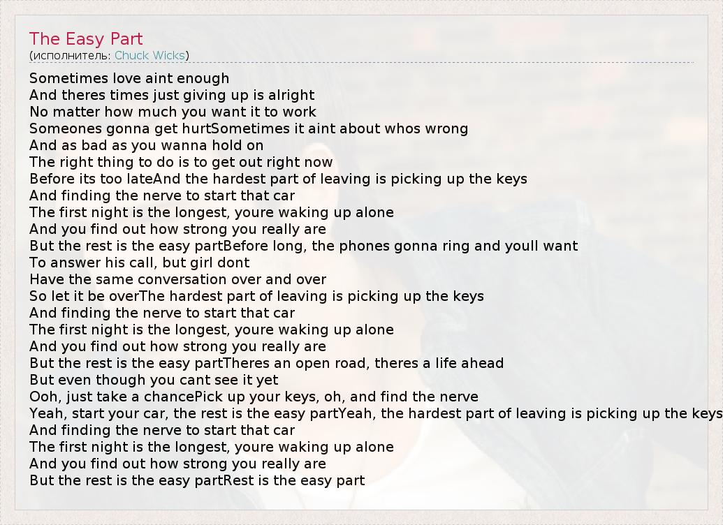 Sometimes love aint enough And theres times just giving up is alright No matter how much you want it to work Someones gonna get hurtSometimes it aint about whos wrong And as bad as you wanna hold on The right thing to do is to get out right now Before its too lateAnd the hardest part of leaving is picking up the keys And finding the nerve to start that car The first night is the longest, youre waking up alone And you find out how strong you really are But the rest is the easy partBefore long, the phones gonna ring and youll want To answer his call, but girl dont Have the same conversation over and over So let it be overThe hardest part of leaving is picking up the keys And finding the nerve to start that car The first night is the longest, youre waking up alone And you find out how strong you really are But the rest is the easy partTheres an open road, theres a life ahead But even though you cant see it yet Ooh, just take a chancePick up your keys, oh, and find the nerve Yeah, start your car, the rest is the easy partYeah, the hardest part of leaving is picking up the keys And finding the nerve to start that car The first night is the longest, youre waking up alone And you find out how strong you really are But the rest is the easy partRest is the easy part