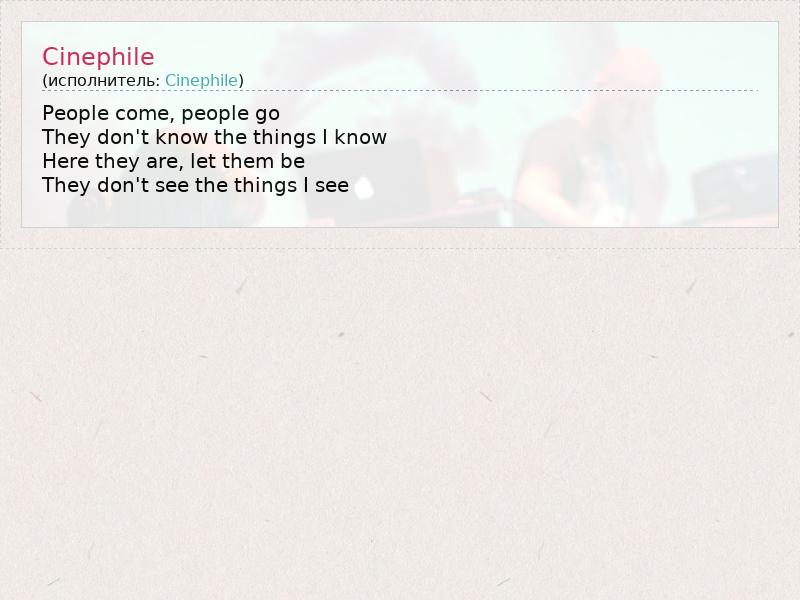 Это интересно:Cinephile — шотландский музыкальный дуэт из Глазго, состоящий из Kenny Inglis и Susan Wallace и играющий в стиле trip-hop. Они известны в основном благодаря своей песне What Become of Us?, использованной в одном из эпизодов CSI.Музыка Cinephile появляется в ряде сериалов и фильмов по всему миру. Кроме того, песня Comatose была использована музыкальной темой к трейлеру фильма с Сэмюэлем Джексоном... продолжение