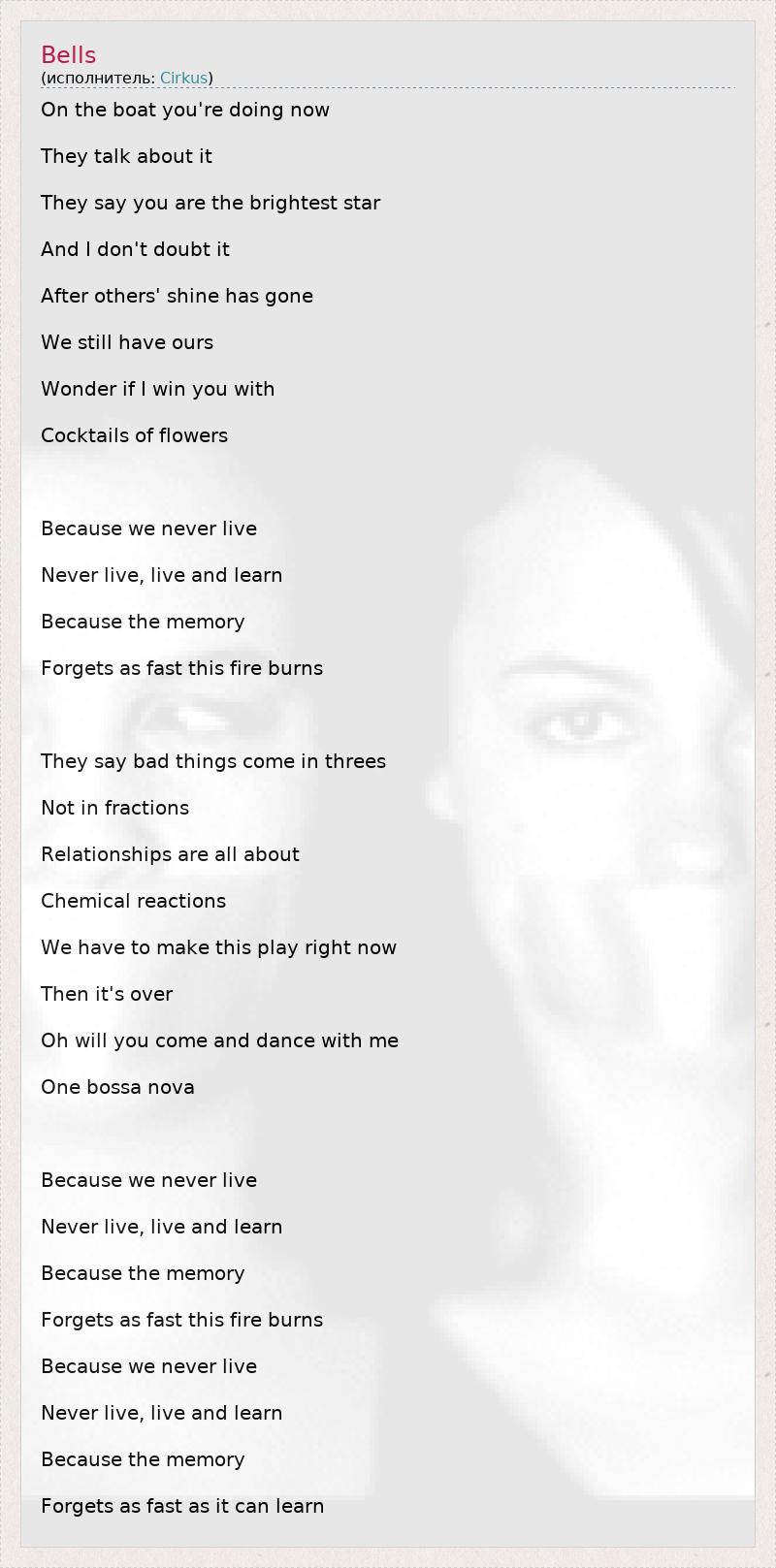 On the boat you're doing now They talk about it They say you are the brightest star And I don't doubt it After others' shine has gone We still have ours Wonder if I win you with Cocktails of flowers Because we never live Never live, live and learn Because the memory Forgets as fast this fire burns They say bad things come in threes Not in fractions Relationships are all about Chemical reactions We have to make this play right now Then it's over Oh will you come and dance with me One bossa nova Because we never live Never live, live and learn Because the memory Forgets as fast this fire burns Because we never live Never live, live and learn Because the memory Forgets as fast as it can learn