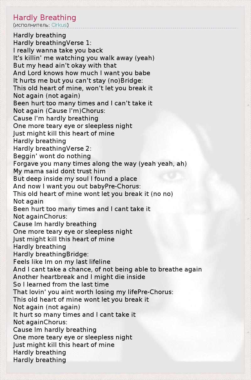 Hardly breathing Hardly breathingVerse 1: I really wanna take you back It's killin' me watching you walk away (yeah) But my head ain't okay with that And Lord knows how much I want you babe It hurts me but you can't stay (no)Bridge: This old heart of mine, won't let you break it Not again (not again) Been hurt too many times and I can't take it Not again (Cause I'm)Chorus: Cause I'm hardly breathing One more teary eye or sleepless night Just might kill this heart of mine Hardly breathing Hardly breathingVerse 2: Beggin' wont do nothing Forgave you many times along the way (yeah yeah, ah) My mama said dont trust him But deep inside my soul I found a place And now I want you out babyPre-Chorus: This old heart of mine wont let you break it (no no) Not again Been hurt too many times and I cant take it Not againChorus: Cause Im hardly breathing One more teary eye or sleepless night Just might kill this heart of mine Hardly breathing Hardly breathingBridge: Feels like Im on my last lifeline And I cant take a chance, of not being able to breathe again Another heartbreak and I might die inside So I learned from the last time That lovin' you aint worth losing my lifePre-Chorus: This old heart of mine wont let you break it Not again (not again) It hurt so many times and I cant take it Not againChorus: Cause Im hardly breathing One more teary eye or sleepless night Just might kill this heart of mine Hardly breathing Hardly breathing