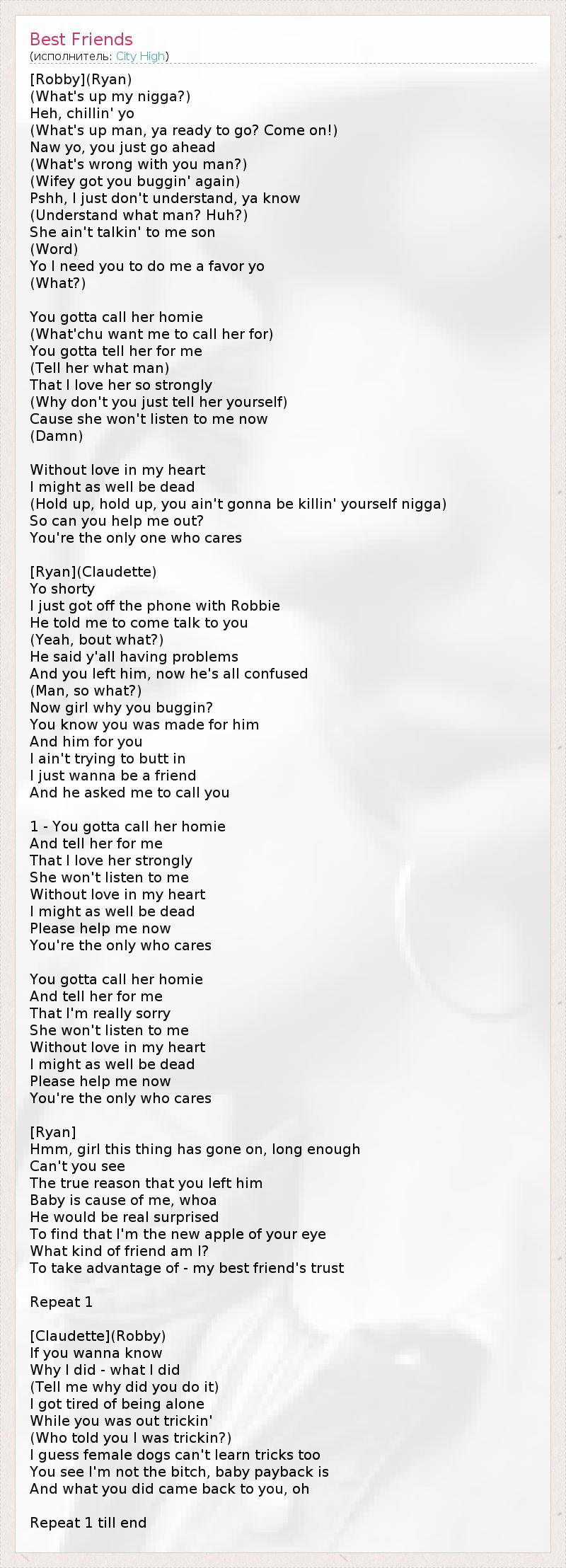[Robby](Ryan) (What's up my nigga?) Heh, chillin' yo (What's up man, ya ready to go? Come on!) Naw yo, you just go ahead (What's wrong with you man?) (Wifey got you buggin' again) Pshh, I just don't understand, ya know (Understand what man? Huh?) She ain't talkin' to me son (Word) Yo I need you to do me a favor yo (What?) You gotta call her homie (What'chu want me to call her for) You gotta tell her for me (Tell her what man) That I love her so strongly (Why don't you just tell her yourself) Cause she won't listen to me now (Damn) Without love in my heart I might as well be dead (Hold up, hold up, you ain't gonna be killin' yourself nigga) So can you help me out? You're the only one who cares [Ryan](Claudette) Yo shorty I just got off the phone with Robbie He told me to come talk to you (Yeah, bout what?) He said y'all having problems And you left him, now he's all confused (Man, so what?) Now girl why you buggin? You know you was made for him And him for you I ain't trying to butt in I just wanna be a friend And he asked me to call you 1 - You gotta call her homie And tell her for me That I love her strongly She won't listen to me Without love in my heart I might as well be dead Please help me now You're the only who cares You gotta call her homie And tell her for me That I'm really sorry She won't listen to me Without love in my heart I might as well be dead Please help me now You're the only who cares [Ryan] Hmm, girl this thing has gone on, long enough Can't you see The true reason that you left him Baby is cause of me, whoa He would be real surprised To find that I'm the new apple of your eye What kind of friend am I? To take advantage of - my best friend's trust Repeat 1 [Claudette](Robby) If you wanna know Why I did - what I did (Tell me why did you do it) I got tired of being alone While you was out trickin' (Who told you I was trickin?) I guess female dogs can't learn tricks too You see I'm not the bitch, baby payback is And what you did came back to you, oh Repeat 1 till end