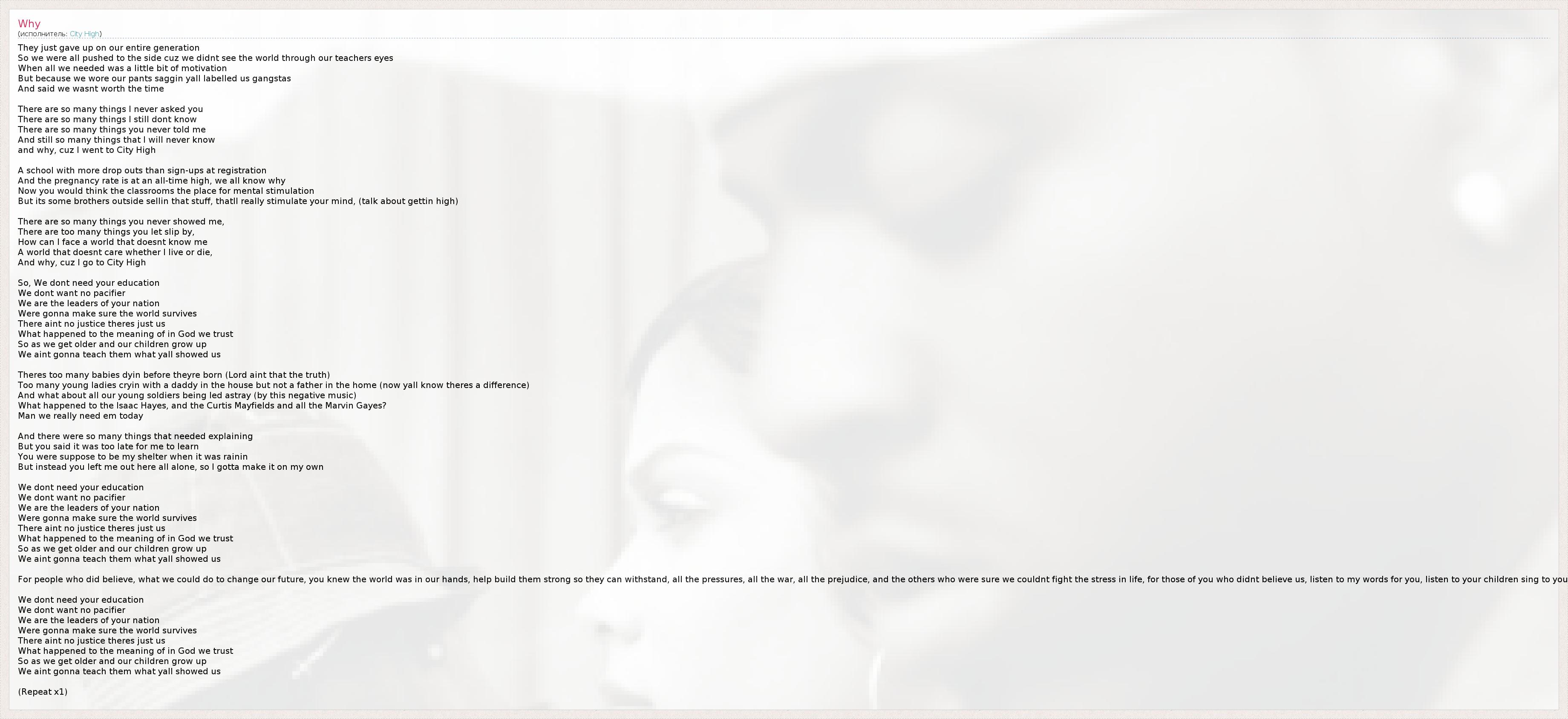 For people who did believe, what we could do to change our future, you knew the world was in our hands, help build them strong so they can withstand, all the pressures, all the war, all the prejudice, and the others who were sure we couldnt fight the stress in life, for those of you who didnt believe us, listen to my words for you, listen to your children sing to you