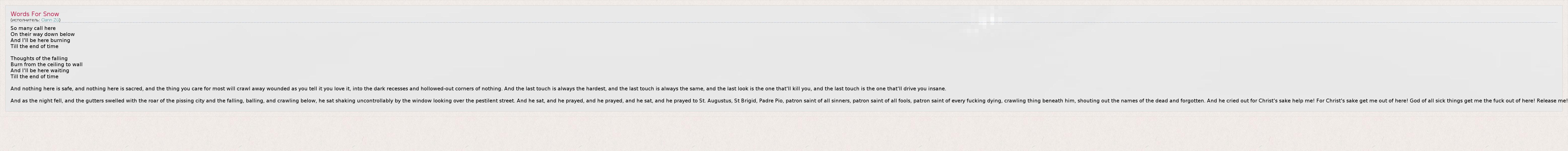 And as the night fell, and the gutters swelled with the roar of the pissing city and the falling, balling, and crawling below, he sat shaking uncontrollably by the window looking over the pestilent street. And he sat, and he prayed, and he prayed, and he sat, and he prayed to St. Augustus, St Brigid, Padre Pio, patron saint of all sinners, patron saint of all fools, patron saint of every fucking dying, crawling thing beneath him, shouting out the names of the dead and forgotten. And he cried out for Christ's sake help me! For Christ's sake get me out of here! God of all sick things get me the fuck out of here! Release me!