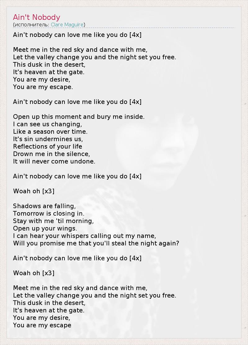 Ain't nobody can love me like you do [4x] Meet me in the red sky and dance with me, Let the valley change you and the night set you free. This dusk in the desert, It's heaven at the gate. You are my desire, You are my escape. Ain't nobody can love me like you do [4x] Open up this moment and bury me inside. I can see us changing, Like a season over time. It's sin undermines us, Reflections of your life Drown me in the silence, It will never come undone. Ain't nobody can love me like you do [4x] Woah oh [x3] Shadows are falling, Tomorrow is closing in. Stay with me 'til morning, Open up your wings. I can hear your whispers calling out my name, Will you promise me that you'll steal the night again? Ain't nobody can love me like you do [4x] Woah oh [x3] Meet me in the red sky and dance with me, Let the valley change you and the night set you free. This dusk in the desert, It's heaven at the gate. You are my desire, You are my escape