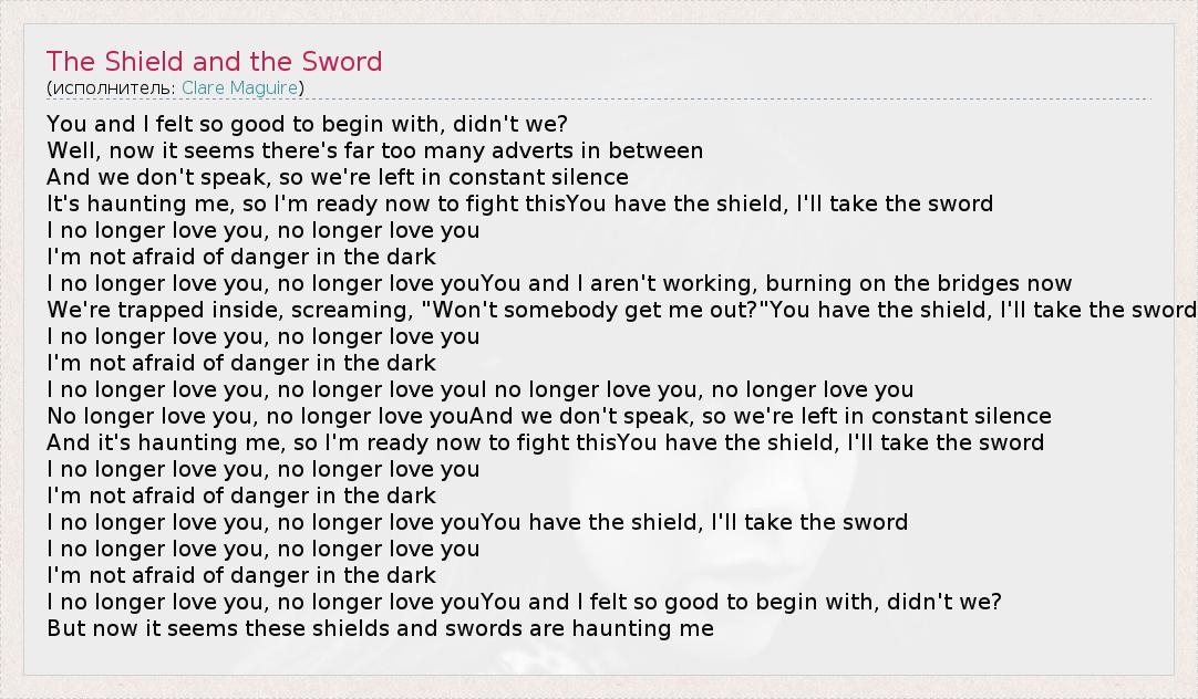 You and I felt so good to begin with, didn't we? Well, now it seems there's far too many adverts in between And we don't speak, so we're left in constant silence It's haunting me, so I'm ready now to fight thisYou have the shield, I'll take the sword I no longer love you, no longer love you I'm not afraid of danger in the dark I no longer love you, no longer love youYou and I aren't working, burning on the bridges now We're trapped inside, screaming, "Won't somebody get me out?"You have the shield, I'll take the sword I no longer love you, no longer love you I'm not afraid of danger in the dark I no longer love you, no longer love youI no longer love you, no longer love you No longer love you, no longer love youAnd we don't speak, so we're left in constant silence And it's haunting me, so I'm ready now to fight thisYou have the shield, I'll take the sword I no longer love you, no longer love you I'm not afraid of danger in the dark I no longer love you, no longer love youYou have the shield, I'll take the sword I no longer love you, no longer love you I'm not afraid of danger in the dark I no longer love you, no longer love youYou and I felt so good to begin with, didn't we? But now it seems these shields and swords are haunting me
