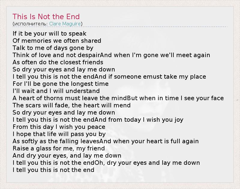 If it be your will to speak Of memories we often shared Talk to me of days gone by Think of love and not despairAnd when I'm gone we'll meet again As often do the closest friends So dry your eyes and lay me down I tell you this is not the endAnd if someone emust take my place For I'll be gone the longest time I'll wait and I will understand A heart of thorns must leave the mindBut when in time I see your face The scars will fade, the heart will mend So dry your eyes and lay me down I tell you this is not the endAnd from today I wish you joy From this day I wish you peace I hope that life will pass you by As softly as the falling leavesAnd when your heart is full again Raise a glass for me, my friend And dry your eyes, and lay me down I tell you this is not the endOh, dry your eyes and lay me down I tell you this is not the end