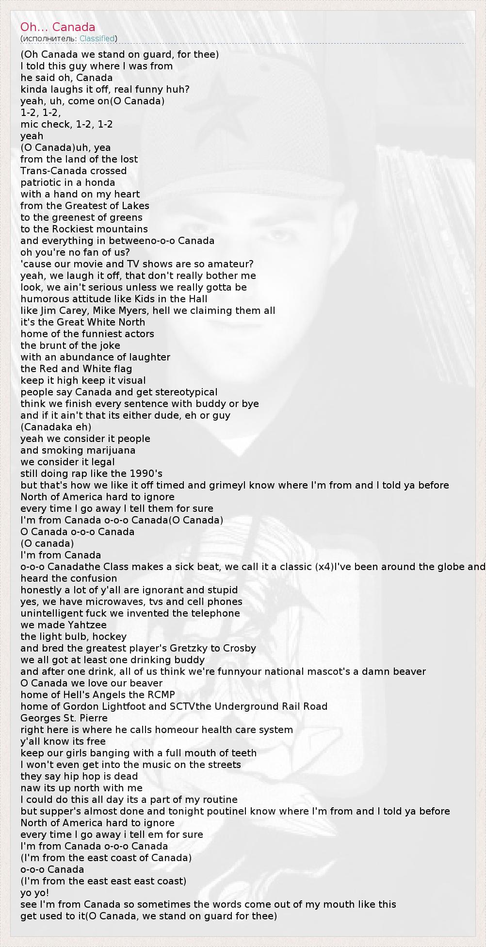 (Oh Canada we stand on guard, for thee) I told this guy where I was from he said oh, Canada kinda laughs it off, real funny huh? yeah, uh, come on(O Canada) 1-2, 1-2, mic check, 1-2, 1-2 yeah (O Canada)uh, yea from the land of the lost Trans-Canada crossed patriotic in a honda with a hand on my heart from the Greatest of Lakes to the greenest of greens to the Rockiest mountains and everything in betweeno-o-o Canada oh you're no fan of us? 'cause our movie and TV shows are so amateur? yeah, we laugh it off, that don't really bother me look, we ain't serious unless we really gotta be humorous attitude like Kids in the Hall like Jim Carey, Mike Myers, hell we claiming them all it's the Great White North home of the funniest actors the brunt of the joke with an abundance of laughter the Red and White flag keep it high keep it visual people say Canada and get stereotypical think we finish every sentence with buddy or bye and if it ain't that its either dude, eh or guy (Canadaka eh) yeah we consider it people and smoking marijuana we consider it legal still doing rap like the 1990's but that's how we like it off timed and grimeyI know where I'm from and I told ya before North of America hard to ignore every time I go away I tell them for sure I'm from Canada o-o-o Canada(O Canada) O Canada o-o-o Canada (O canada) I'm from Canada o-o-o Canadathe Class makes a sick beat, we call it a classic (x4)I've been around the globe and heard the confusion honestly a lot of y'all are ignorant and stupid yes, we have microwaves, tvs and cell phones unintelligent fuck we invented the telephone we made Yahtzee the light bulb, hockey and bred the greatest player's Gretzky to Crosby we all got at least one drinking buddy and after one drink, all of us think we're funnyour national mascot's a damn beaver O Canada we love our beaver home of Hell's Angels the RCMP home of Gordon Lightfoot and SCTVthe Underground Rail Road Georges St. Pierre right here is where he calls homeour health care system y'all know its free keep our girls banging with a full mouth of teeth I won't even get into the music on the streets they say hip hop is dead naw its up north with me I could do this all day its a part of my routine but supper's almost done and tonight poutineI know where I'm from and I told ya before North of America hard to ignore every time I go away i tell em for sure I'm from Canada o-o-o Canada (I'm from the east coast of Canada) o-o-o Canada (I'm from the east east east coast) yo yo! see I'm from Canada so sometimes the words come out of my mouth like this get used to it(O Canada, we stand on guard for thee)