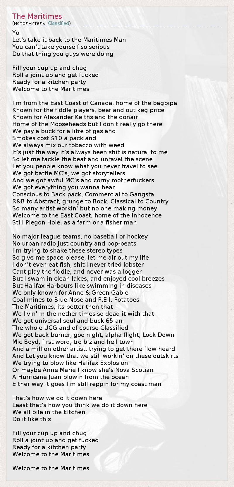Yo Let's take it back to the Maritimes Man You can't take yourself so serious Do that thing you guys were doing Fill your cup up and chug Roll a joint up and get fucked Ready for a kitchen party Welcome to the Maritimes I'm from the East Coast of Canada, home of the bagpipe Known for the fiddle players, beer and out keg price Known for Alexander Keiths and the donair Home of the Mooseheads but I don't really go there We pay a buck for a litre of gas and Smokes cost $10 a pack and We always mix our tobacco with weed It's just the way it's always been shit is natural to me So let me tackle the beat and unravel the scene Let you people know what you never travel to see We got battle MC's, we got storytellers And we got awful MC's and corny motherfuckers We got everything you wanna hear Conscious to Back pack, Commercial to Gangsta R&B to Abstract, grunge to Rock, Classical to Country So many artist workin' but no one making money Welcome to the East Coast, home of the innocence Still Piegon Hole, as a farm or a fisher man No major league teams, no baseball or hockey No urban radio Just country and pop-beats I'm trying to shake these stereo types So give me space please, let me air out my life I don't even eat fish, shit I never tried lobster Cant play the fiddle, and never was a logger But I swam in clean lakes, and enjoyed cool breezes But Halifax Harbours like swimming in diseases We only known for Anne & Green Gable Coal mines to Blue Nose and P.E.I. Potatoes The Maritimes, its better then that We livin' in the nether times so dead it with that We got universal soul and buck 65 an The whole UCG and of course Classified We got back burner, goo night, alpha flight, Lock Down Mic Boyd, first word, tro biz and hell town And a million other artist, trying to get there flow heard And Let you know that we still workin' on these outskirts We trying to blow like Halifax Explosion Or maybe Anne Marie I know she's Nova Scotian A Hurricane Juan blowin from the ocean Either way it goes I'm still reppin for my coast man That's how we do it down here Least that's how you think we do it down here We all pile in the kitchen Do it like this Fill your cup up and chug Roll a joint up and get fucked Ready for a kitchen party Welcome to the Maritimes Welcome to the Maritimes